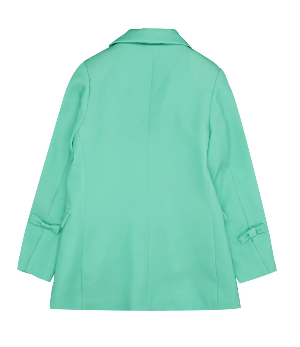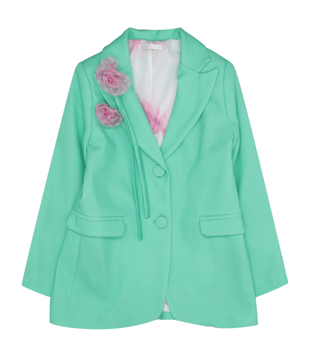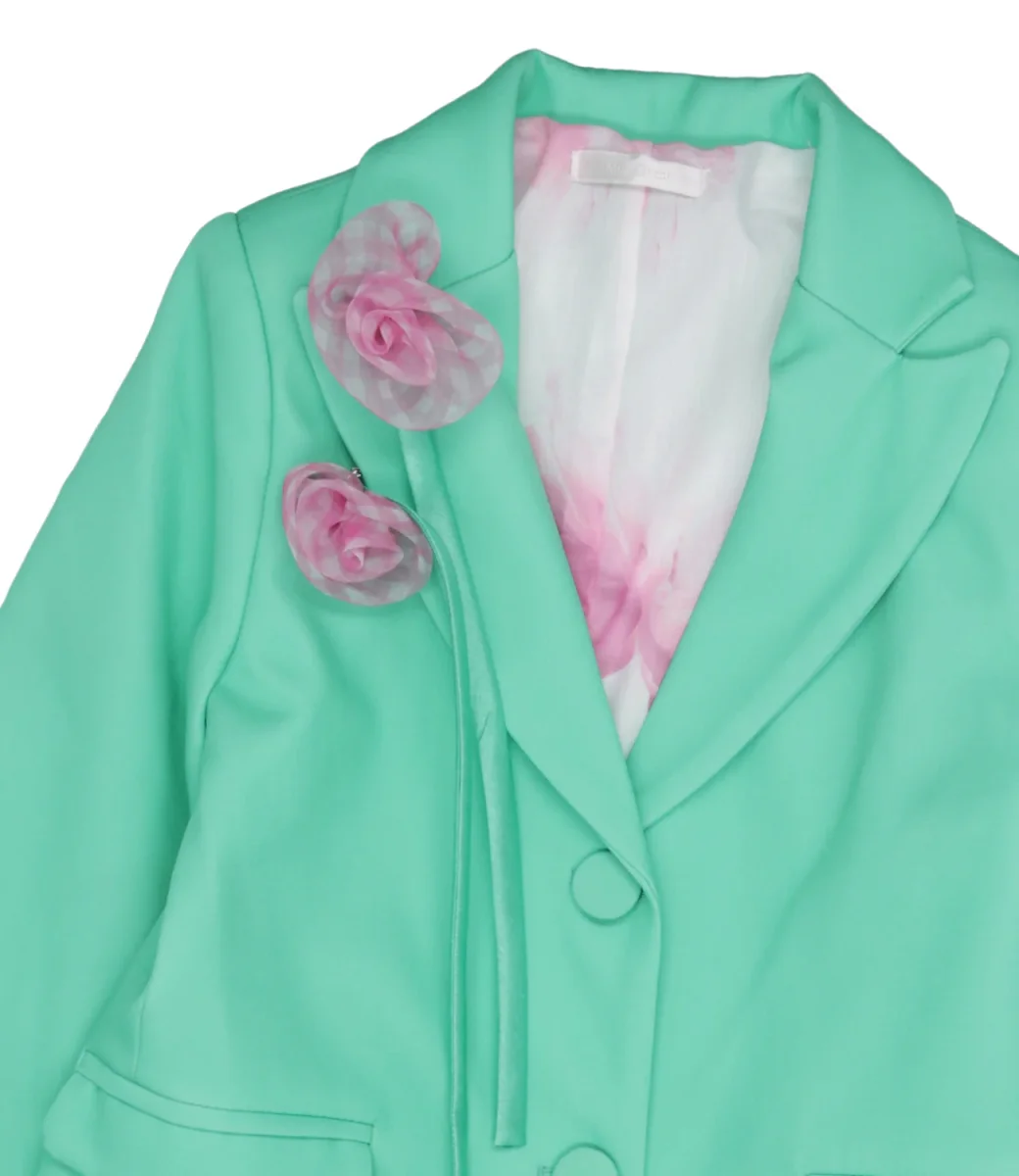 Giacca Miss Grant in cotone smeraldo con revers classici, abbottonatura frontale, tasche a patta laterali, maniche lunghe con fiocchetti decorativi applicati sul retro del polso e spille floreali applicate sul lato sinistro del torace.