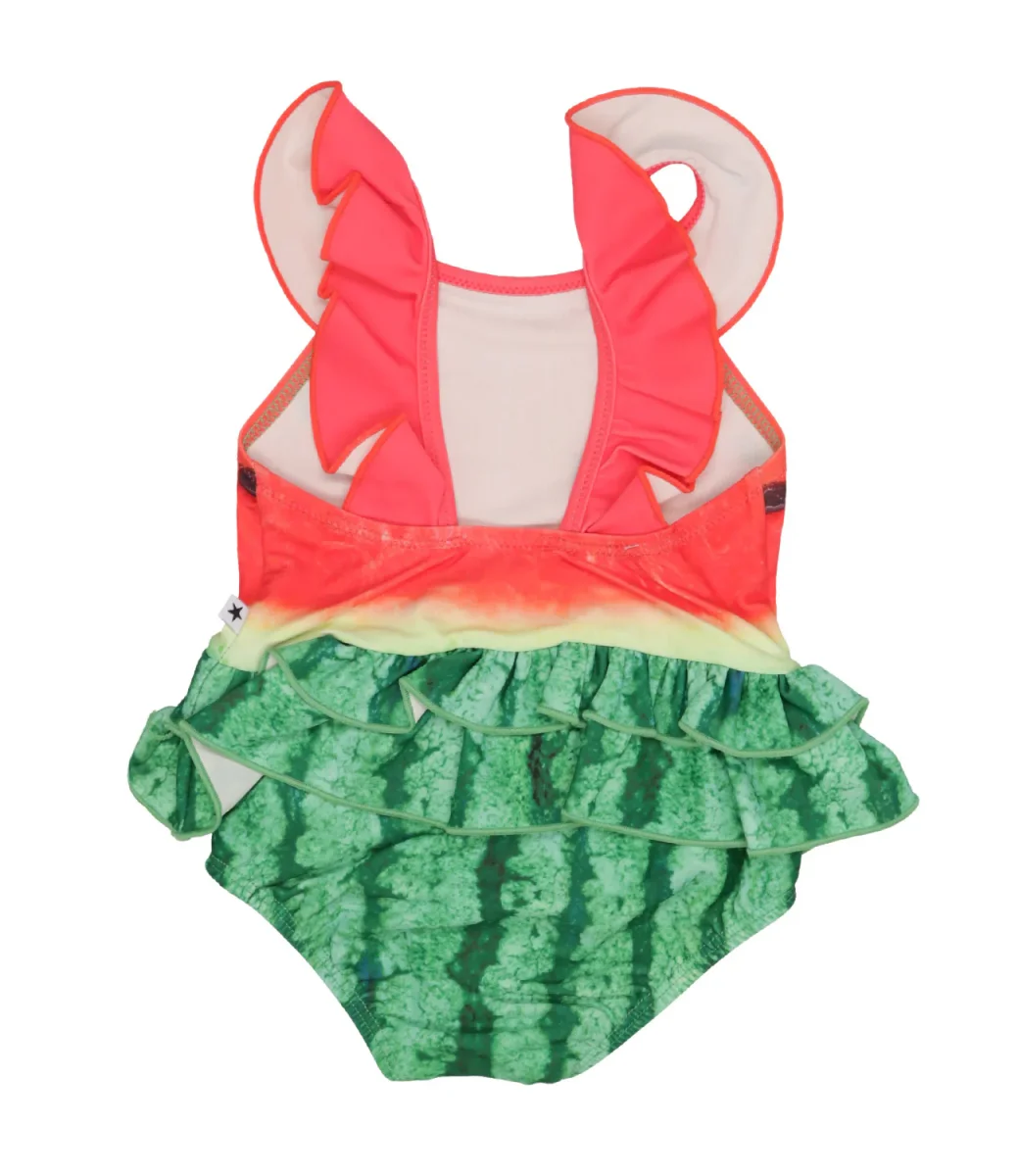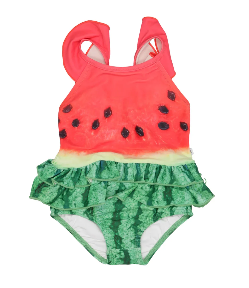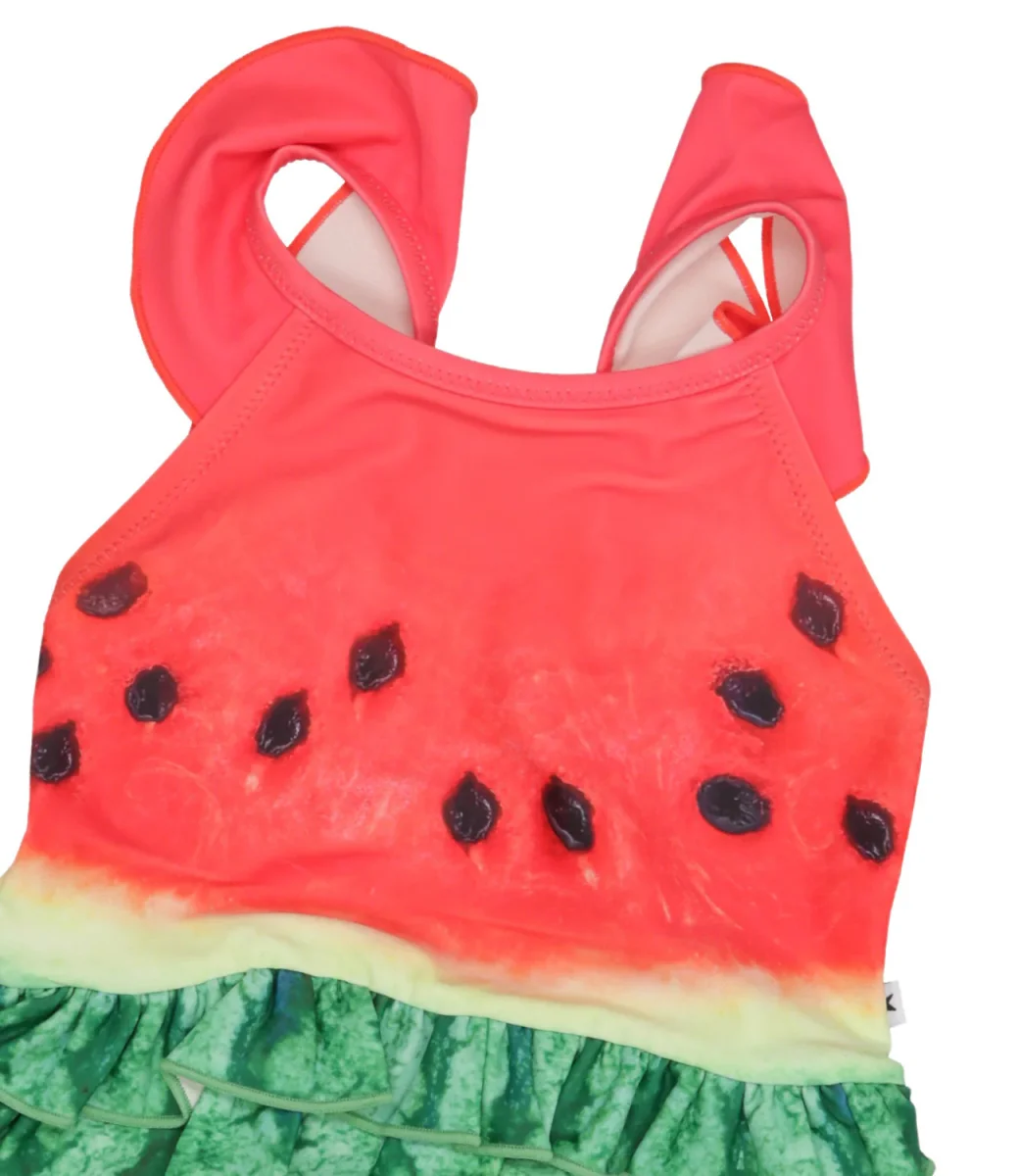 Costume Intero Molo Nalani in tessuto riciclato con protezione UV 50+. Fantasia con stampa di una grande anguria matura, arricchita con volant sui fianchi. Prodotto certificato CE e testato secondo la norma EN-13758-1. Molo è certificato GRS da Ecocert Greenlife, licenza n. 197496.