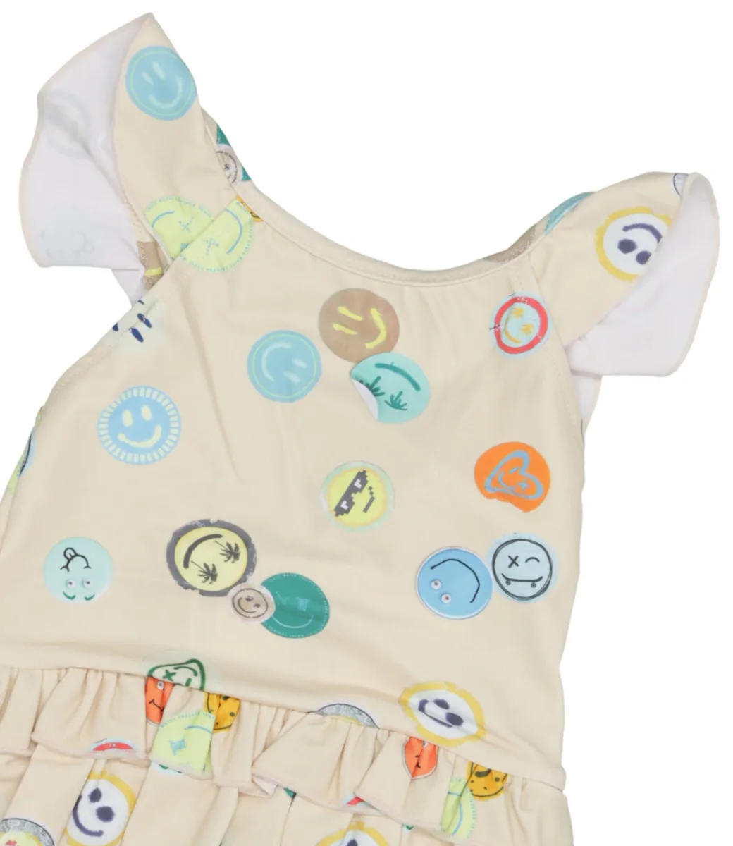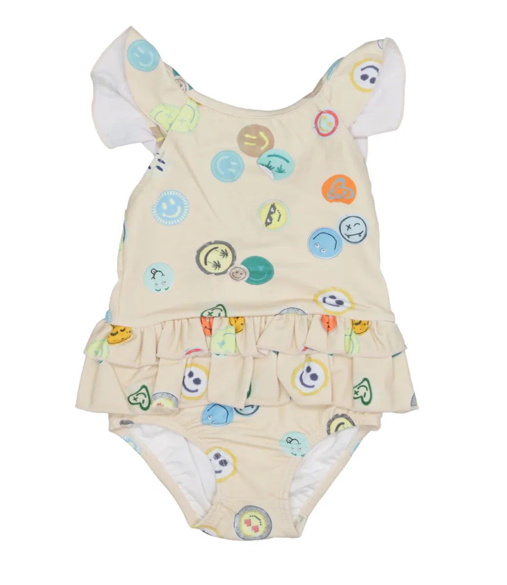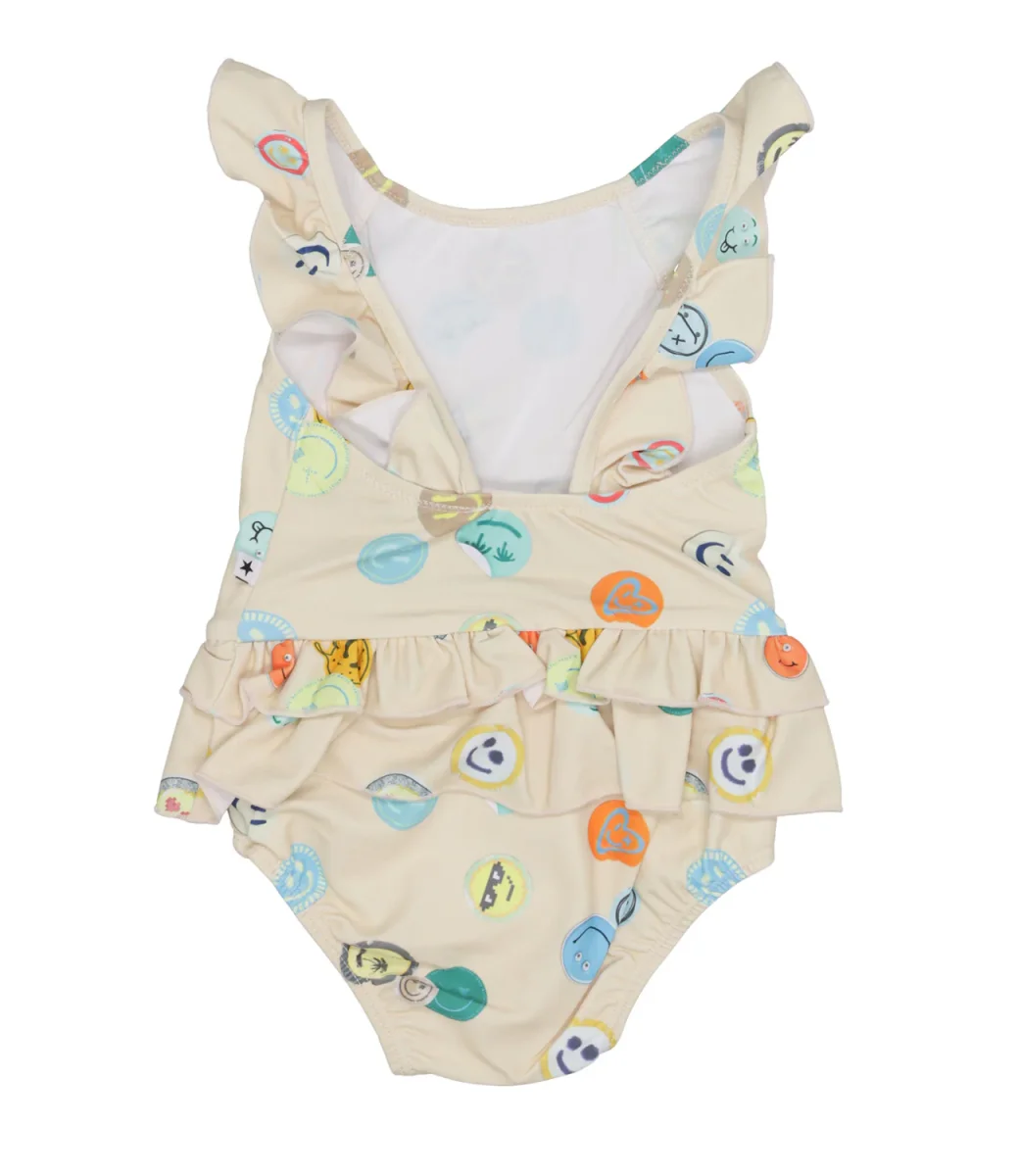 Costume Intero Molo Nalani in tessuto riciclato con protezione UV 50+. Fantasia con stampa con faccine sorridenti e smile iconica del brand, arricchita con volant sui fianchi. Prodotto certificato CE e testato secondo la norma EN-13758-1. Molo è certificato GRS da Ecocert Greenlife, licenza n. 197496.
