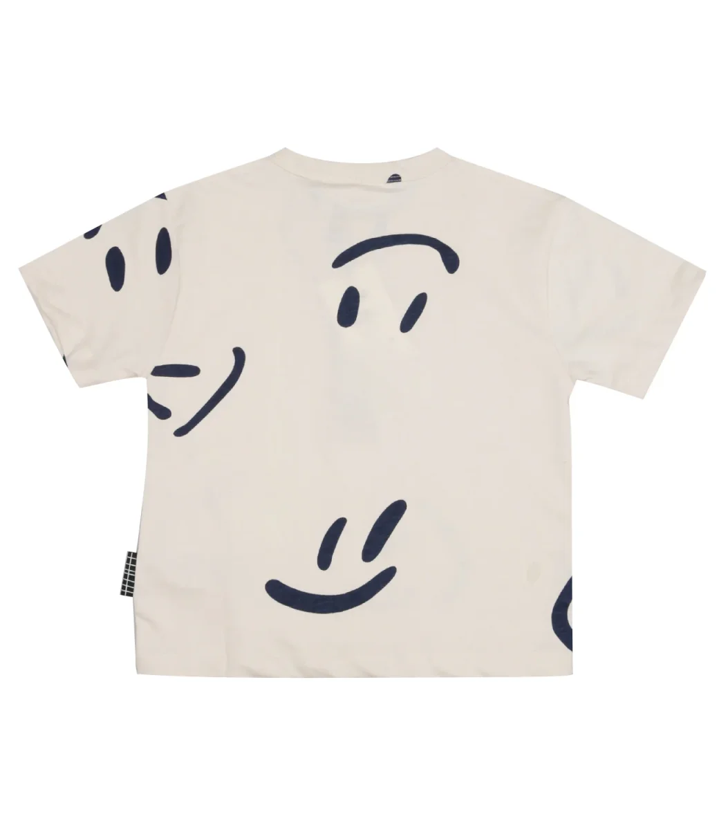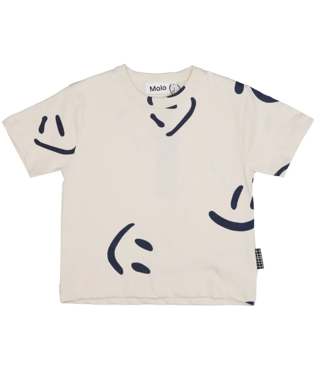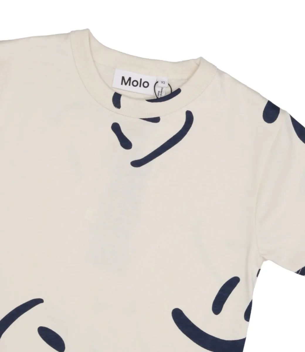 T-Shirt Molo Riley in cotone biologico, con maniche corte, girocollo con bordo a coste, vestibilità ampia, stampa all-over di faccine sorridenti. Prodotto Molo certificato GOTS Organic da Ecocert Greenlife