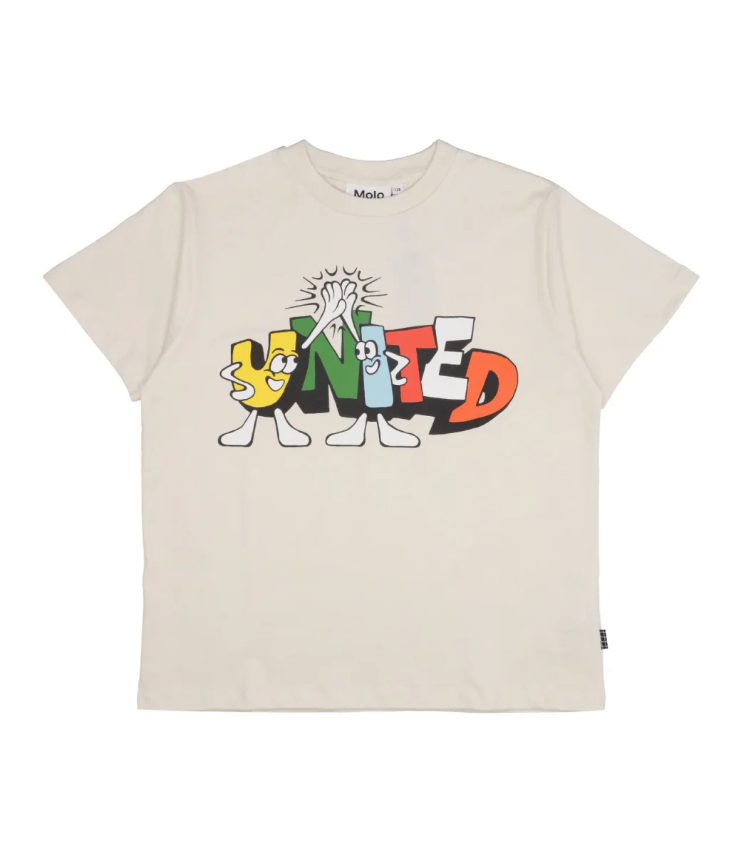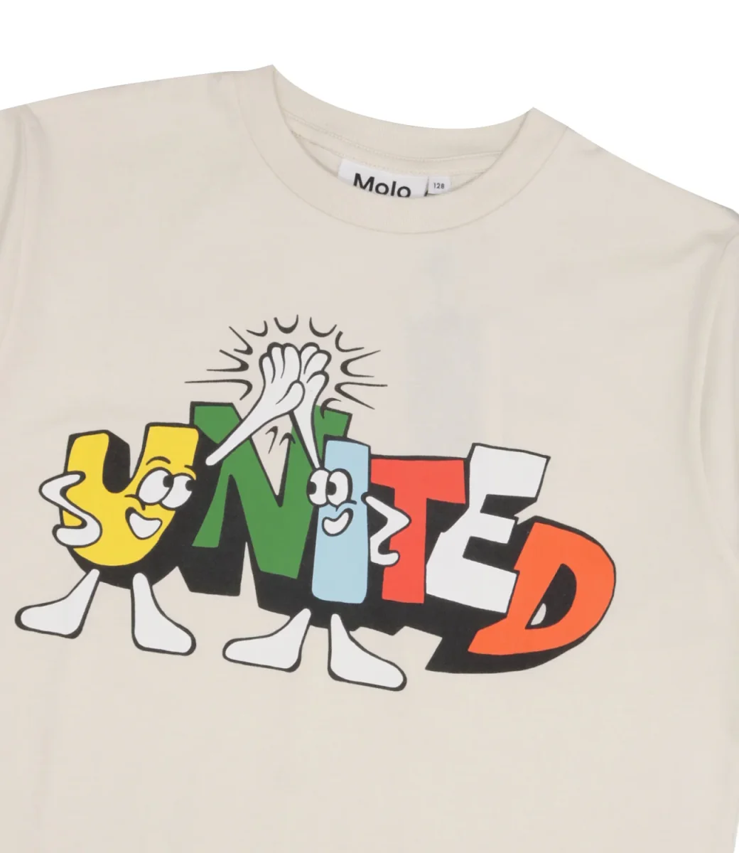 T-Shirt Molo Rodney in cotone biologico. Stampa United animata sul davanti. Prodotto Molo è certificato GOTS Organic da Ecocert Greenlife, licenza n. 197496