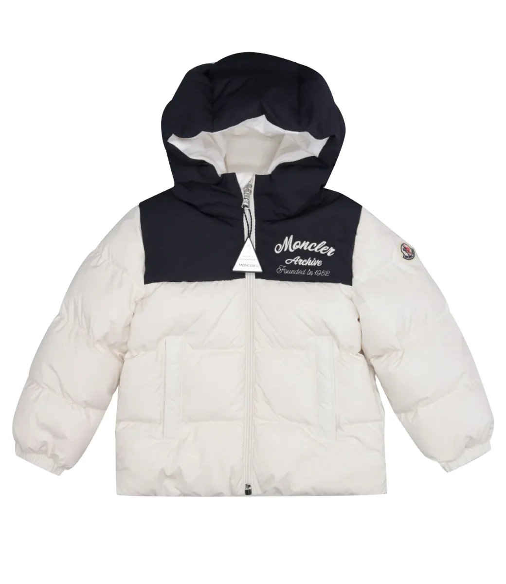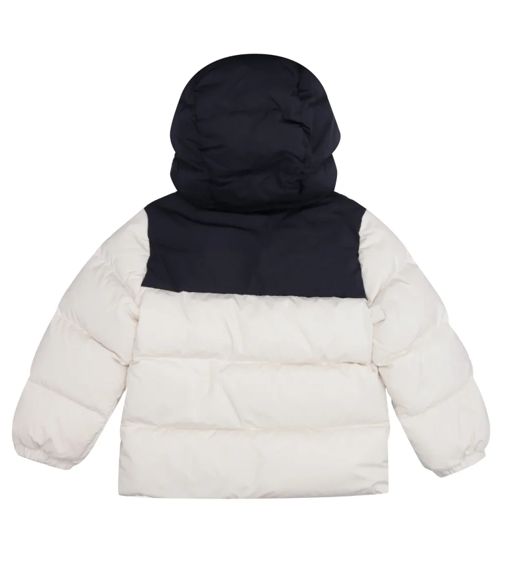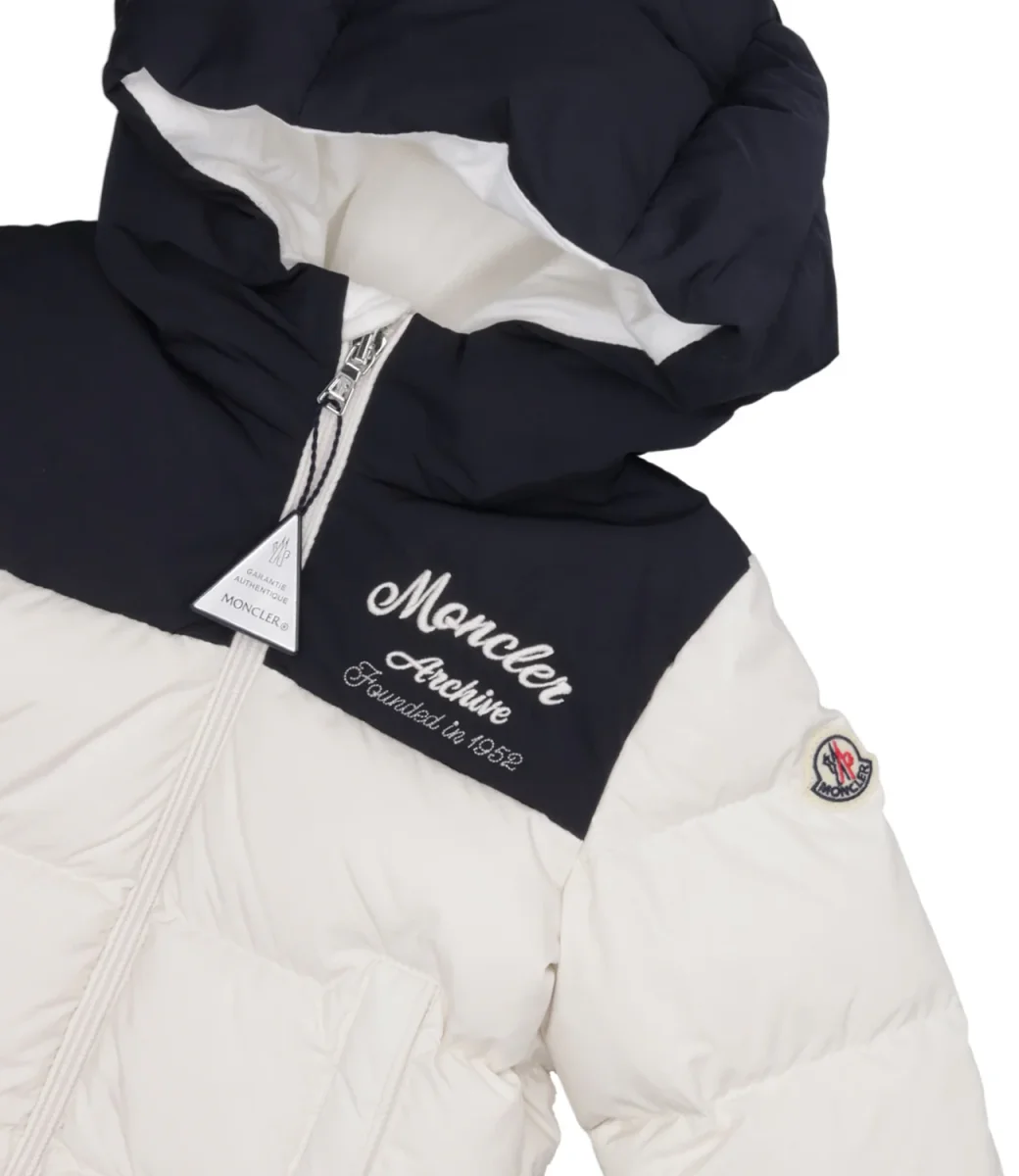 Ispirato ai classici piumini Moncler, Joe è realizzato in poliestere riciclato con un carré testurizzato in nylon a contrasto. Il modello è completato da un pratico cappuccio.