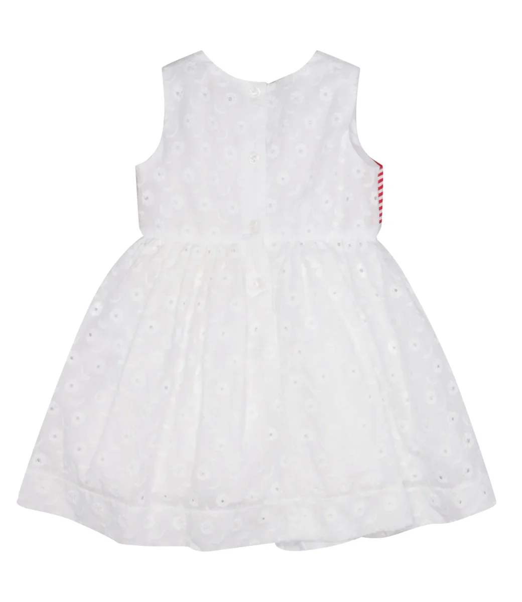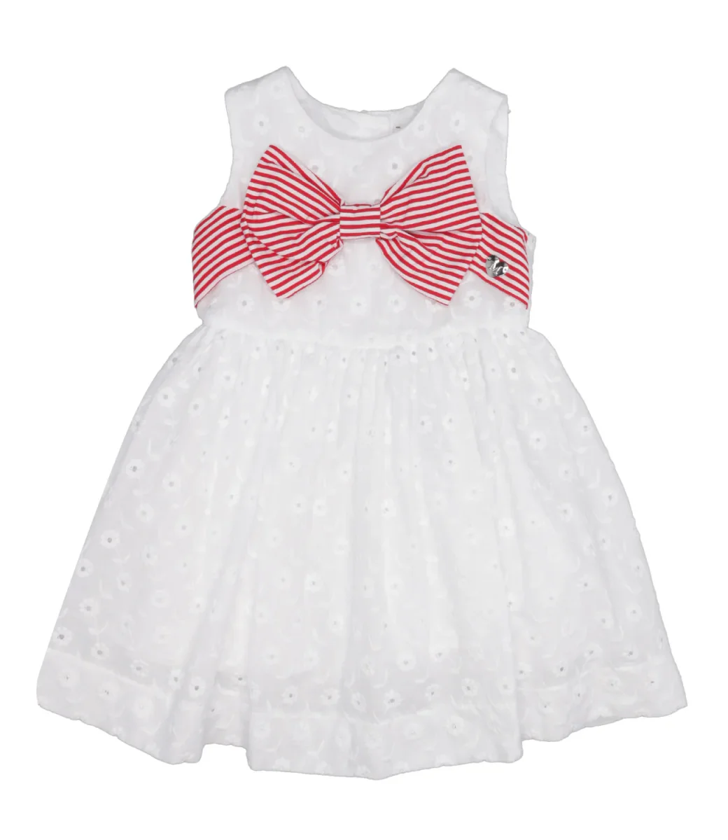 Abito Monnalisa in mussola di cotone, romantico con ricamo all over e maxifiocco sul davanti per occasioni speciali.