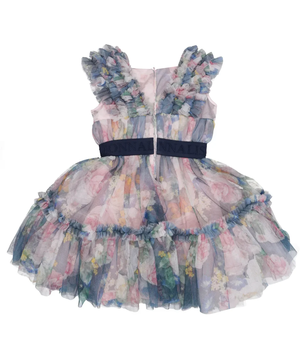 Abito Monnalisa abito romantico, realizzato con tulle manoseta con stampa romantica con rose, modello a clessidra senza maniche,con plissettatura sul corpetto, finto scollo a V con rouche, vita con inserto in tessuto monogram, gonna svasata con balze arricciate, zip invisibile sul retro, fodera mussola e tulle.