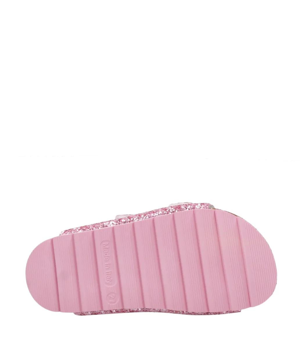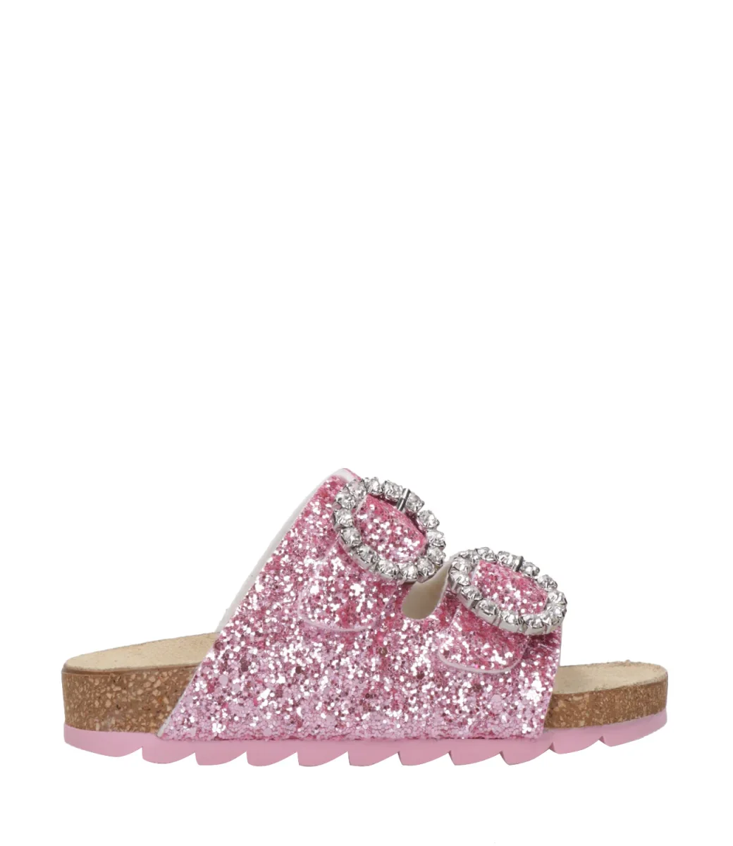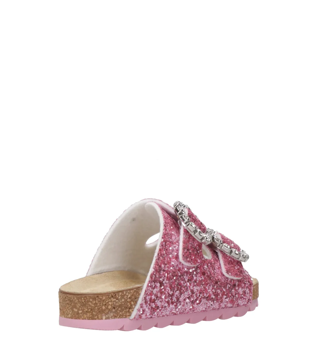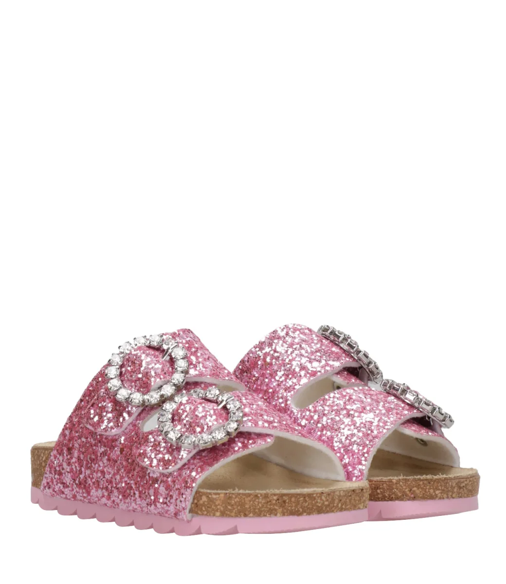 Ciabatta Monnalisa in denim glitterato, con doppia fascia, chiusura regolabile con fibbia gioiello, suola in gomma naturale con effetto antiscivolo, soletta in sughero.