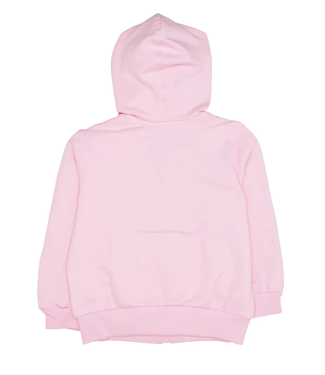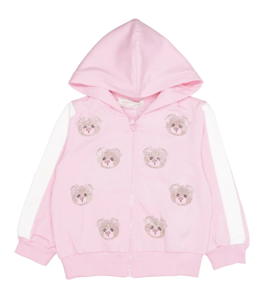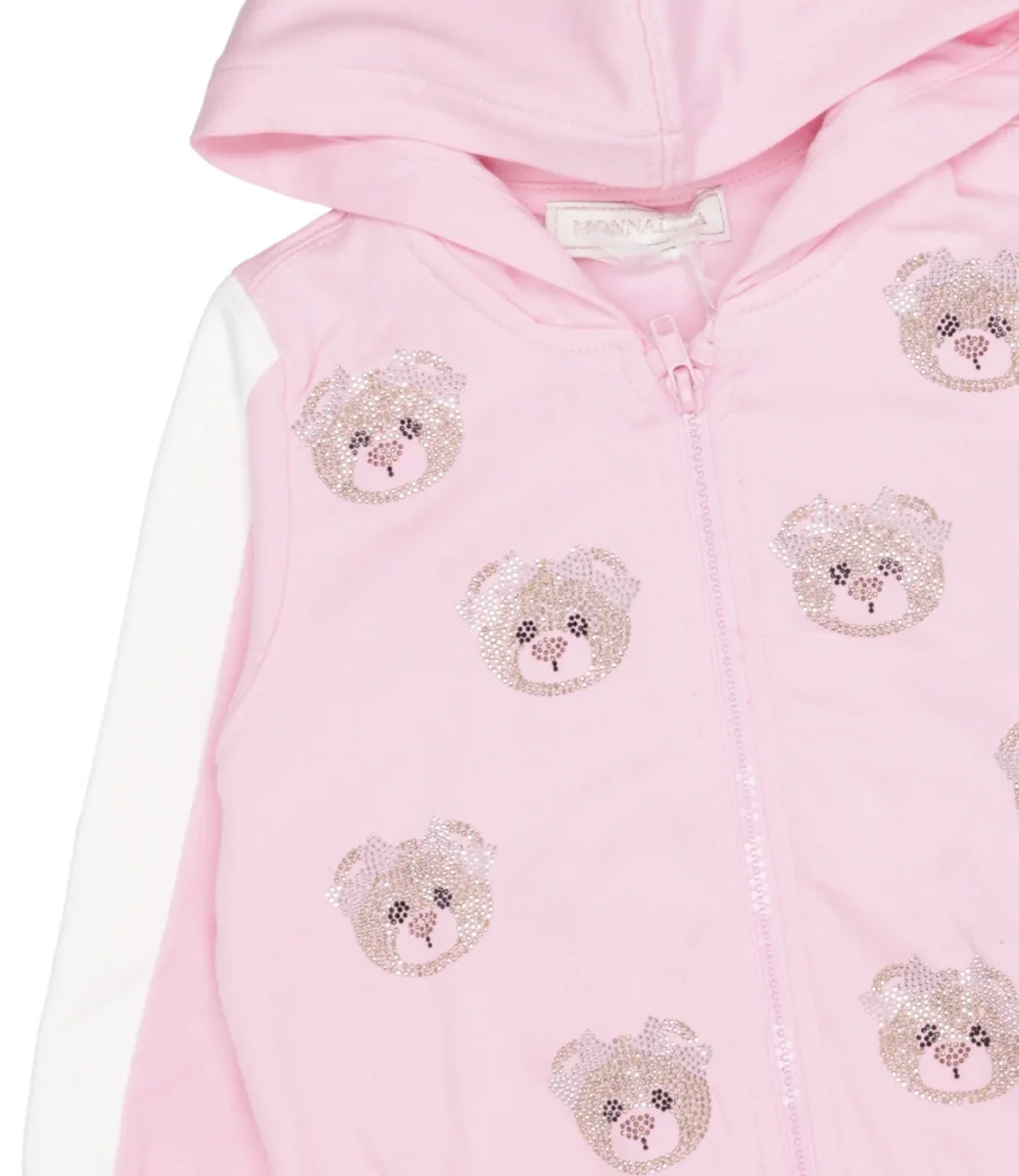 Felpa Monnalisa in felpa di cotone con bande a contrasto di colore sulle maniche, con cappuccio, decoro con orsetti ricamati in strass allover sul torace, maniche lunghe con polsini a costine, chiusura con zip, fondo con bordo a costine.
