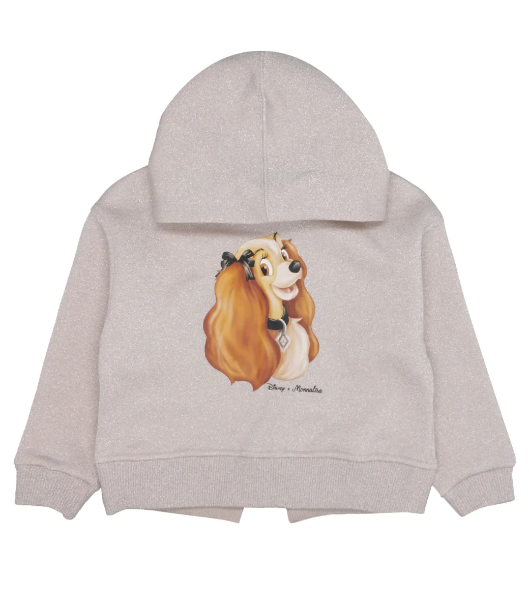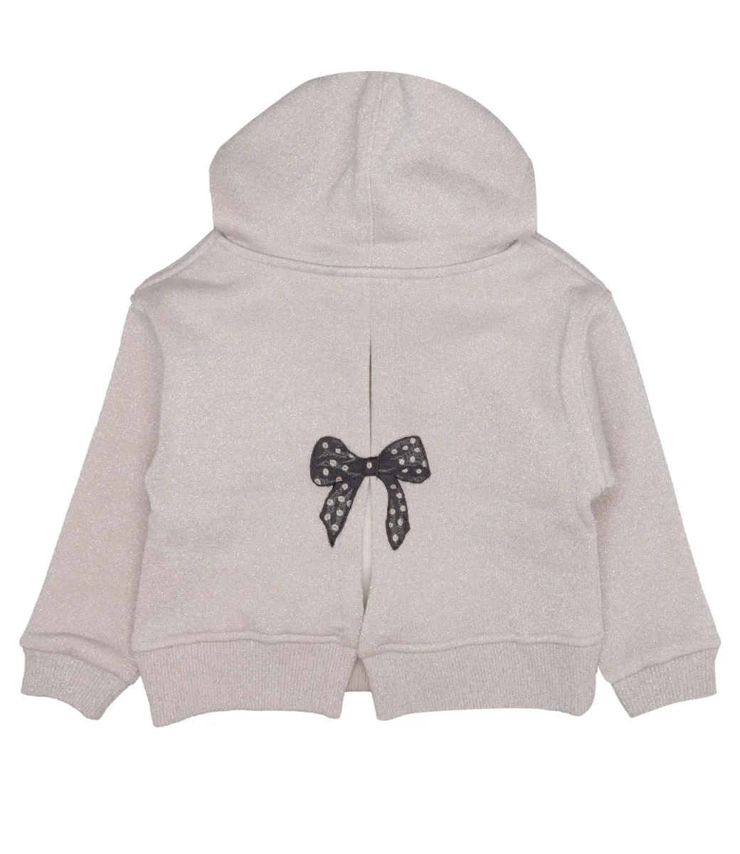Felpa Monnalisa in felpa di cotone con lurex, con cappuccio, maniche lunghe con polsini a costine, spacco sul retro con fiocco ricamato e applicato, fondo con bordo a costine, maxi stampa personaggio Lilli sul davanti