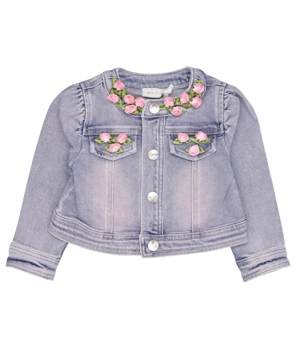 Giacca Monnalisa in denim di cotone, girocollo con bordo decorato con roselline in tessuto, chiusura frontale con zip in metallo, pattine con roselline applicate sul petto, maniche lunghe con polsini con bottoni, fondo dritto.