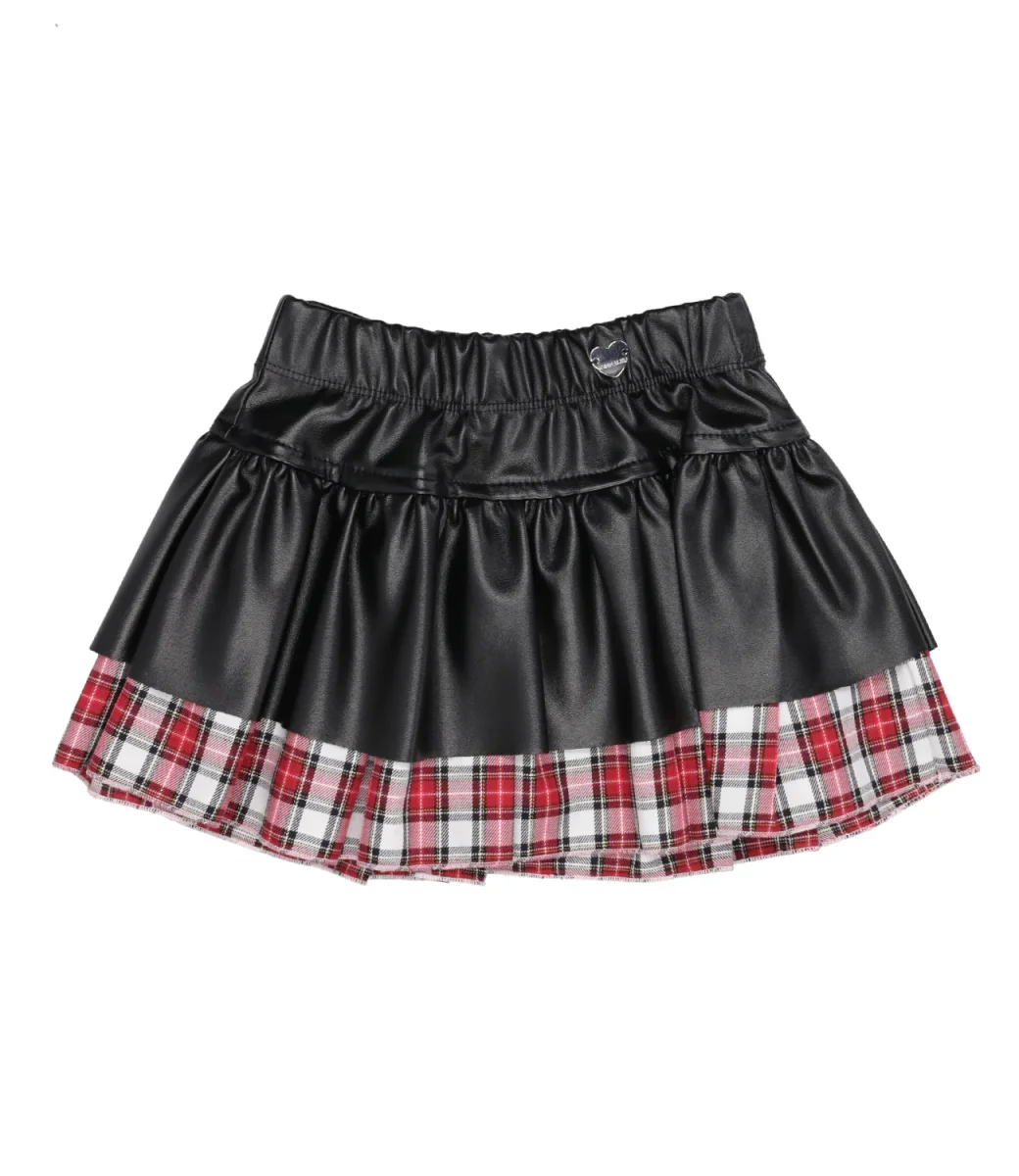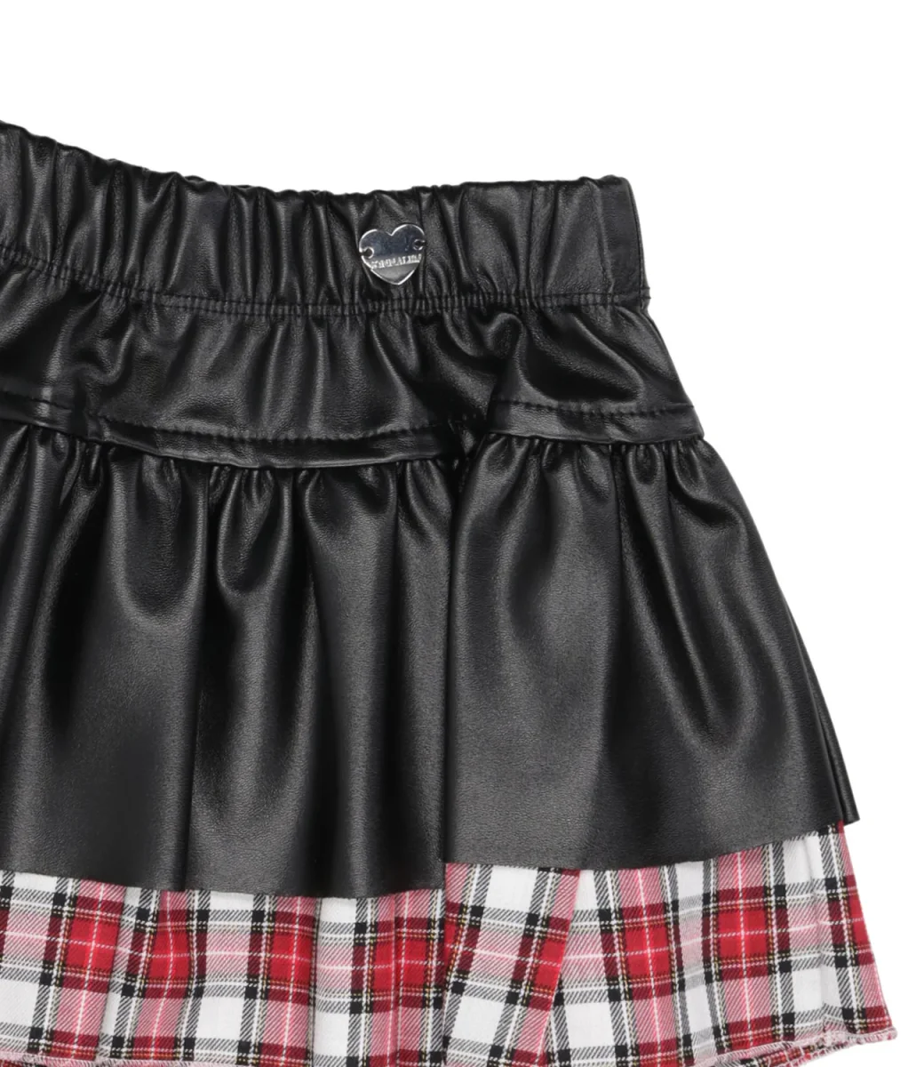 Gonna Monnalisa in eco-pelle, modello a balze di cui una in tessuto con fantasia tartan, vita elasticizzata con cuore in metallo logato applicato, linea svasata, sfoderata.