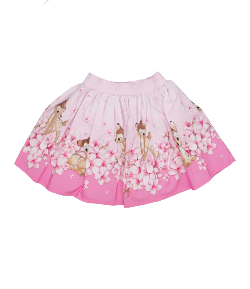 Gonna Monnalisa in popeline cotone, stampa floreale con personaggi iconici Disney, vita con banda lastica con logo ricamato. Design romantico e giocoso con inserto sottogonna in tulle, Linea a ruota.