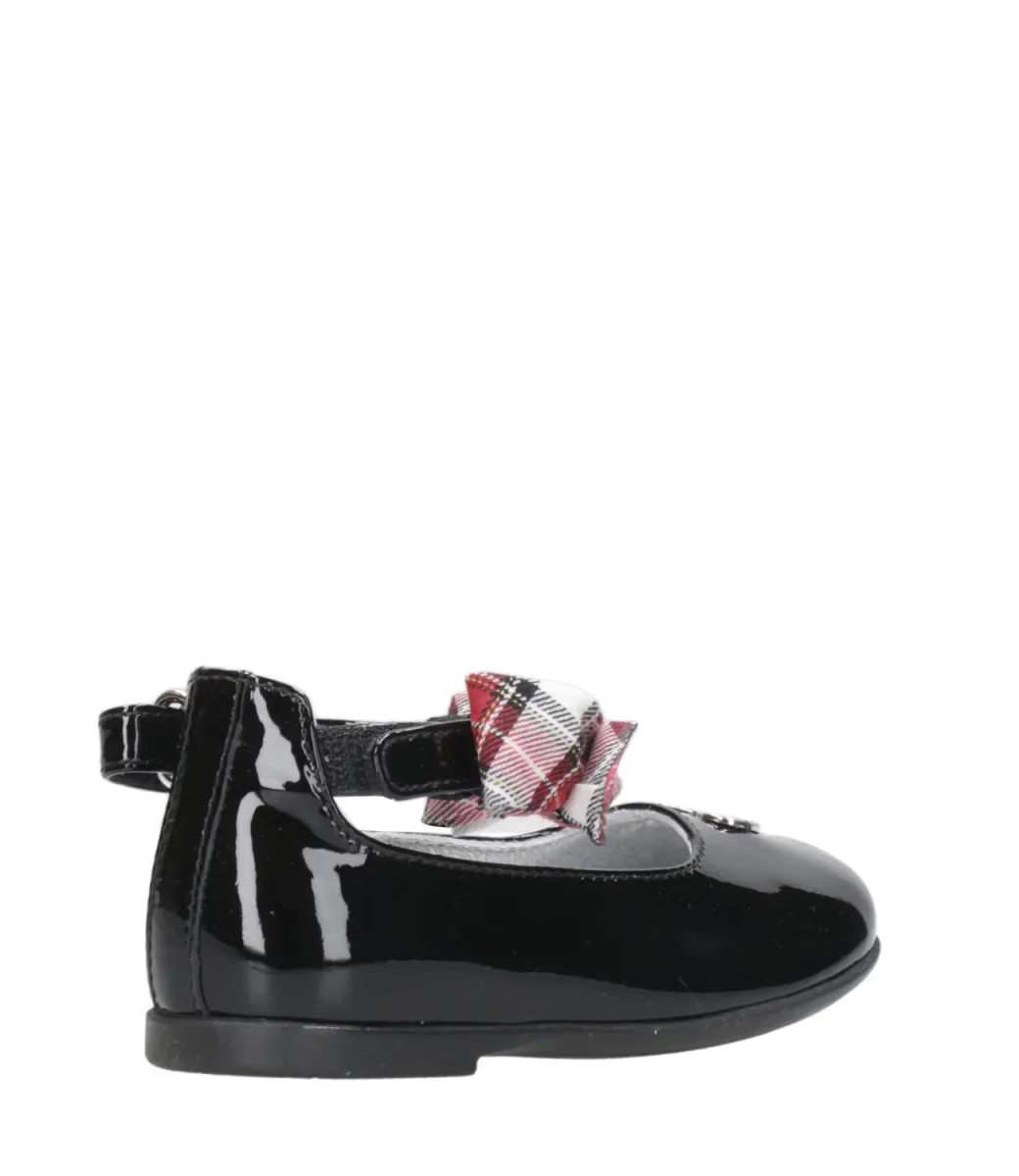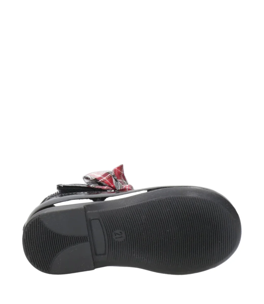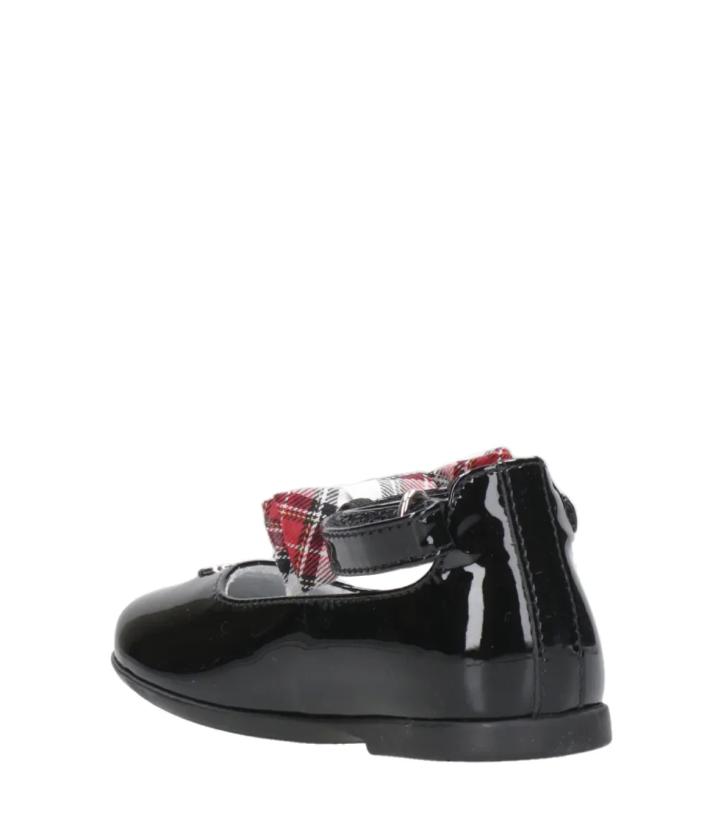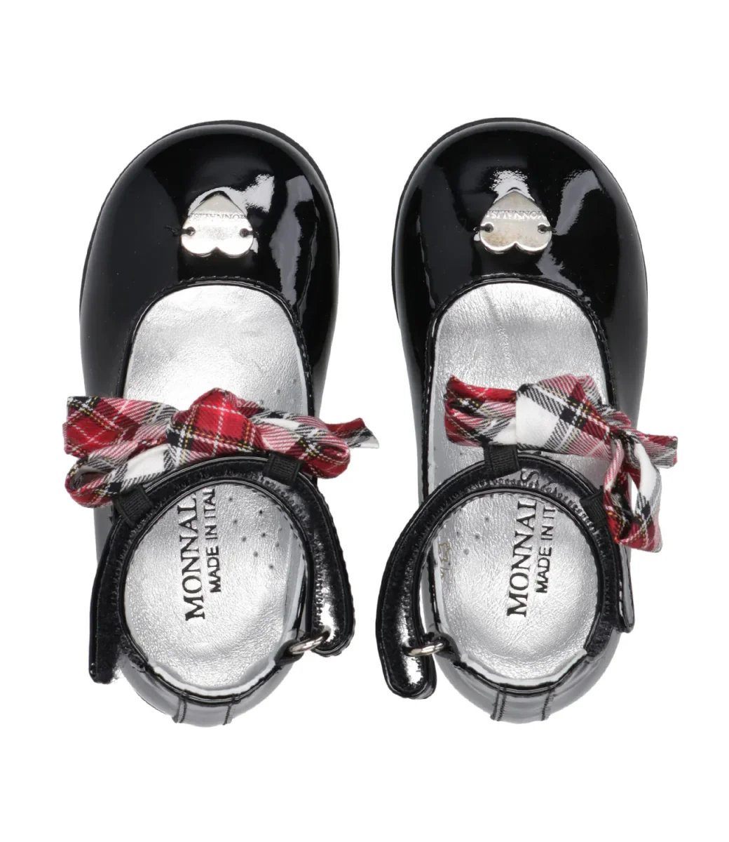 Scarpa Monnalisa in vernice, chiusura con cinturino alla caviglia con velcro decorato con maxi fiocco in tessuto con fantasia scozzese, soletta in pelle logata, punta tonda con cuore in metallo logato applicato, suola in gomma.