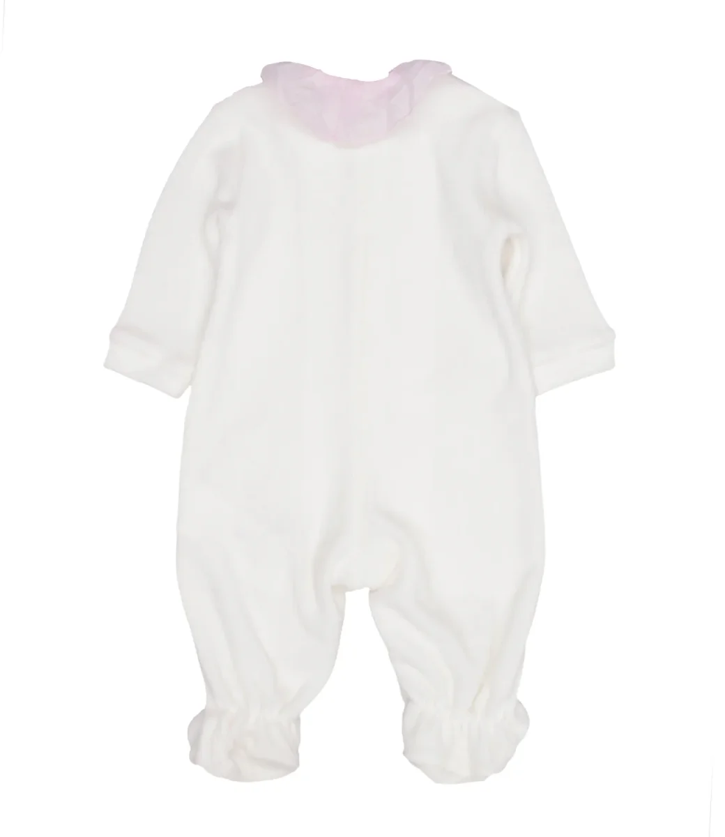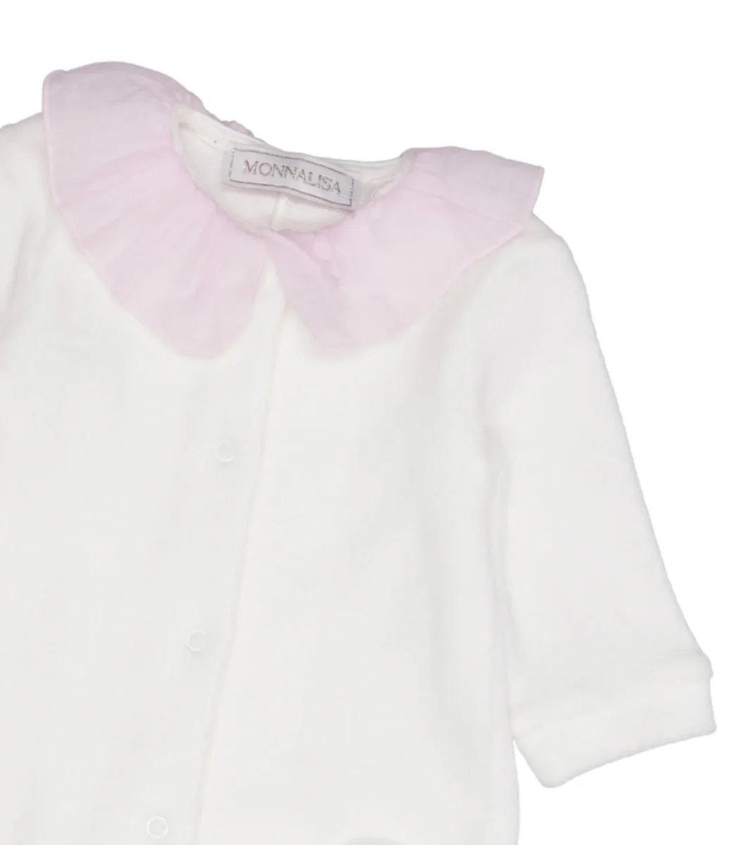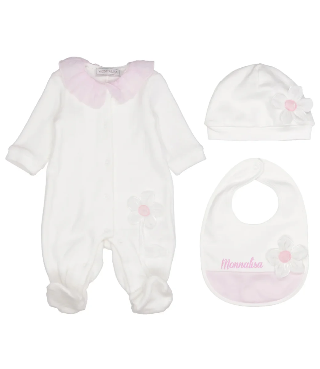 Set Tutina Cappello e Bavaglino Monnalisa in cotone interlock, colletto con rouches in tessuto, chiusura frontale con bottoncini automatici, maniche lunghe con polsini, copripiedi con calottina con elastico, bavaglino bicolore con logo lettering e fiore applicato, chiusura con bottoncino automatico, cuffietta con applicazione di fiore. L’articolo è completo di una scatola in cartone con logo