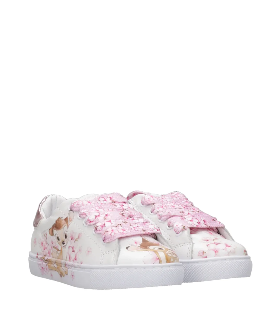 Sneakers Monnalisa in pelle, motivo stampato con fiori di pesco e Bambi sul laterale esterno, chiusura con zip laterale e lacci in tela intrecciata e motivo floreale stampato sulla parte superiore. Topponcino retro caviglia in pelle verniciata, suola in gomma antiscivolo