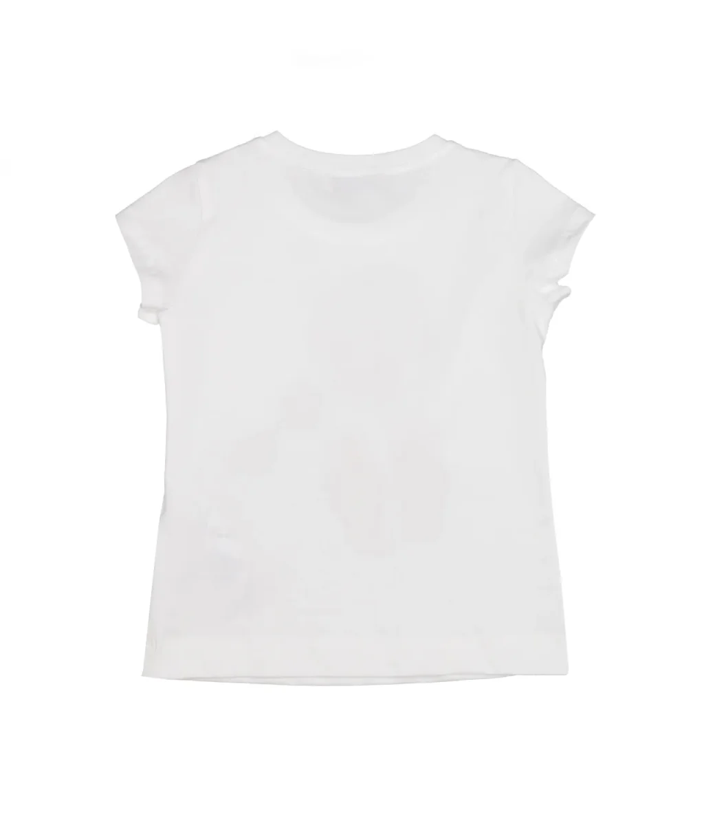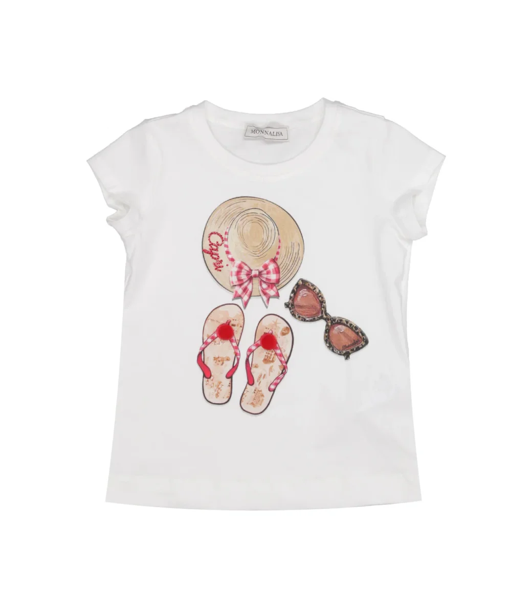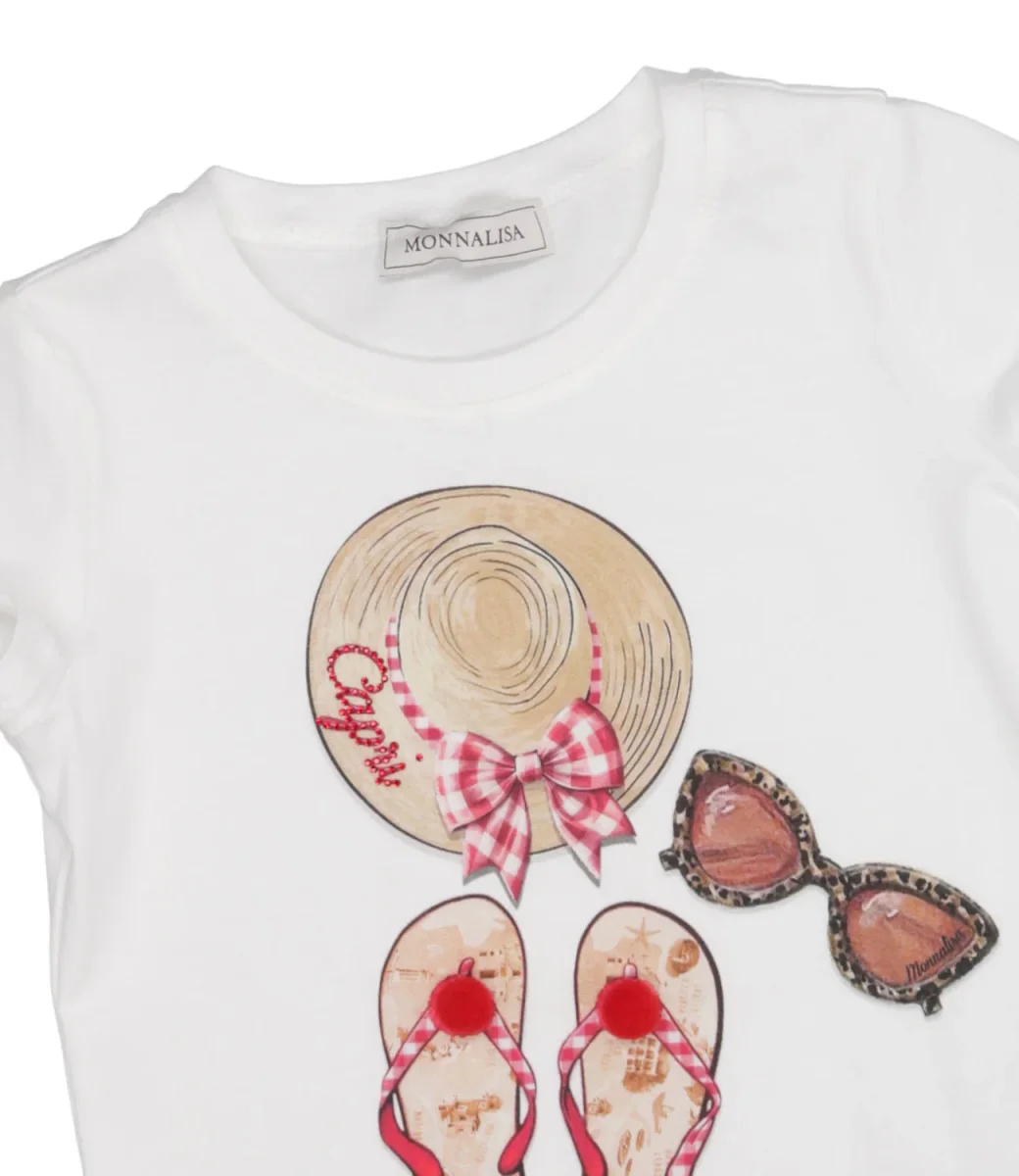 T-Shirt Monnalisa in misto cotone, girocollo, maniche corte, sul torace stampa con cappello in paglia occhiali e ciabattine per rappresentare pienamente la stagione estiva.