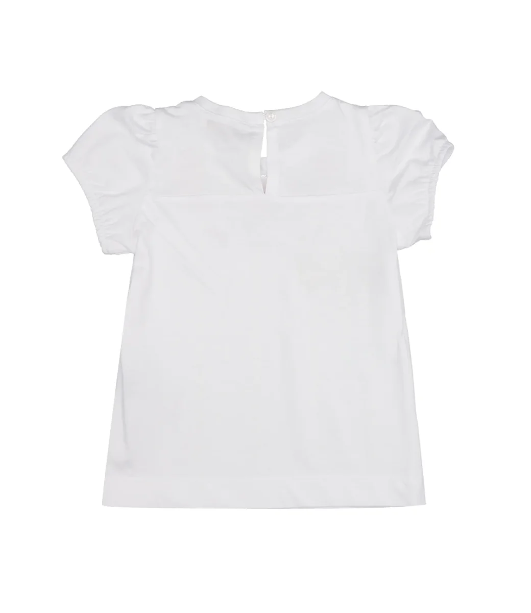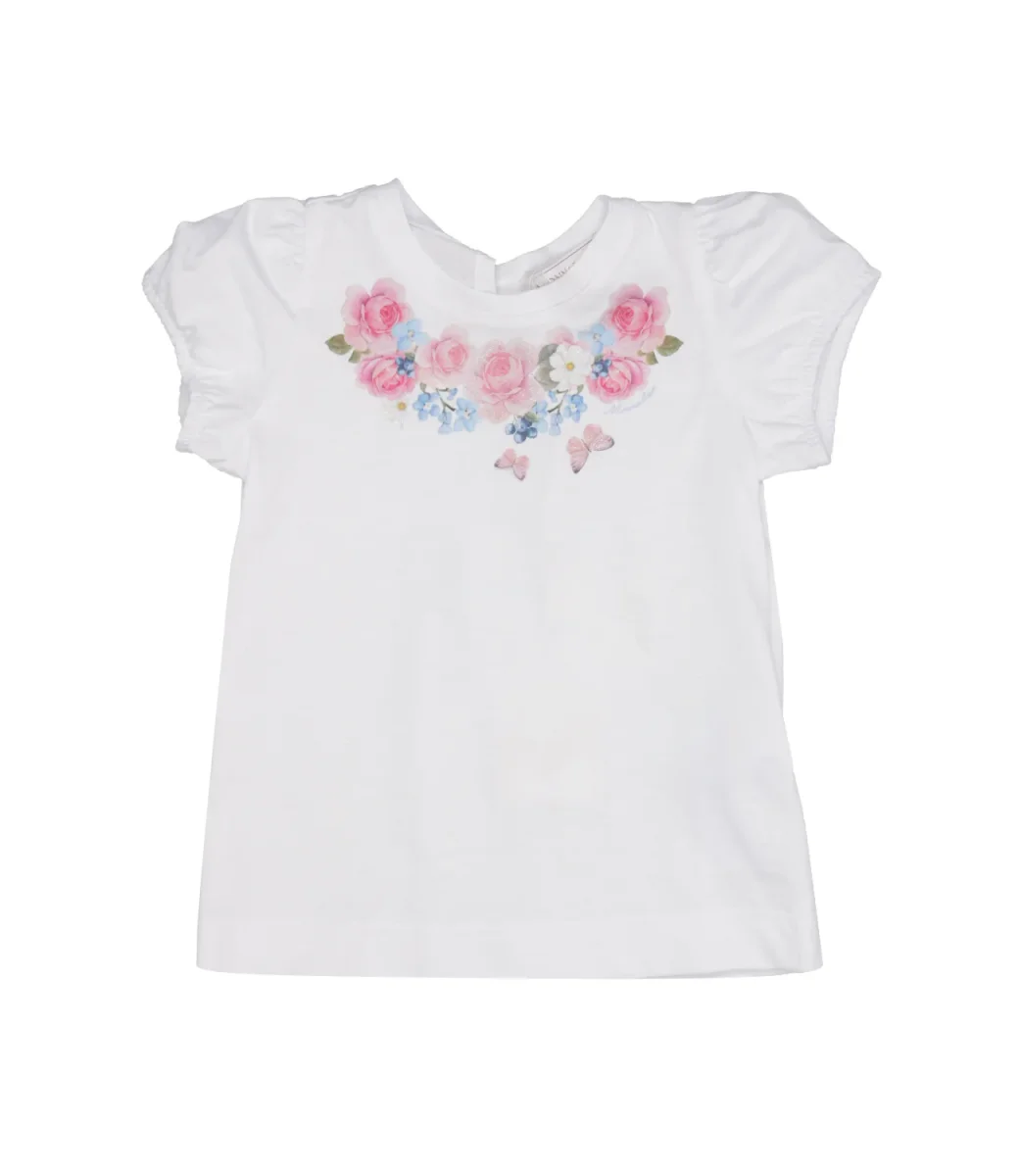 T-shirt Monnalisa in morbido jersey di cotone con stampa di fiori e farfalle sul petto, maniche a sbuffo e apertura a goccia sul retro. Ideale per un look romantico e confortevole, perfetta con jeans leggeri per il quotidiano.