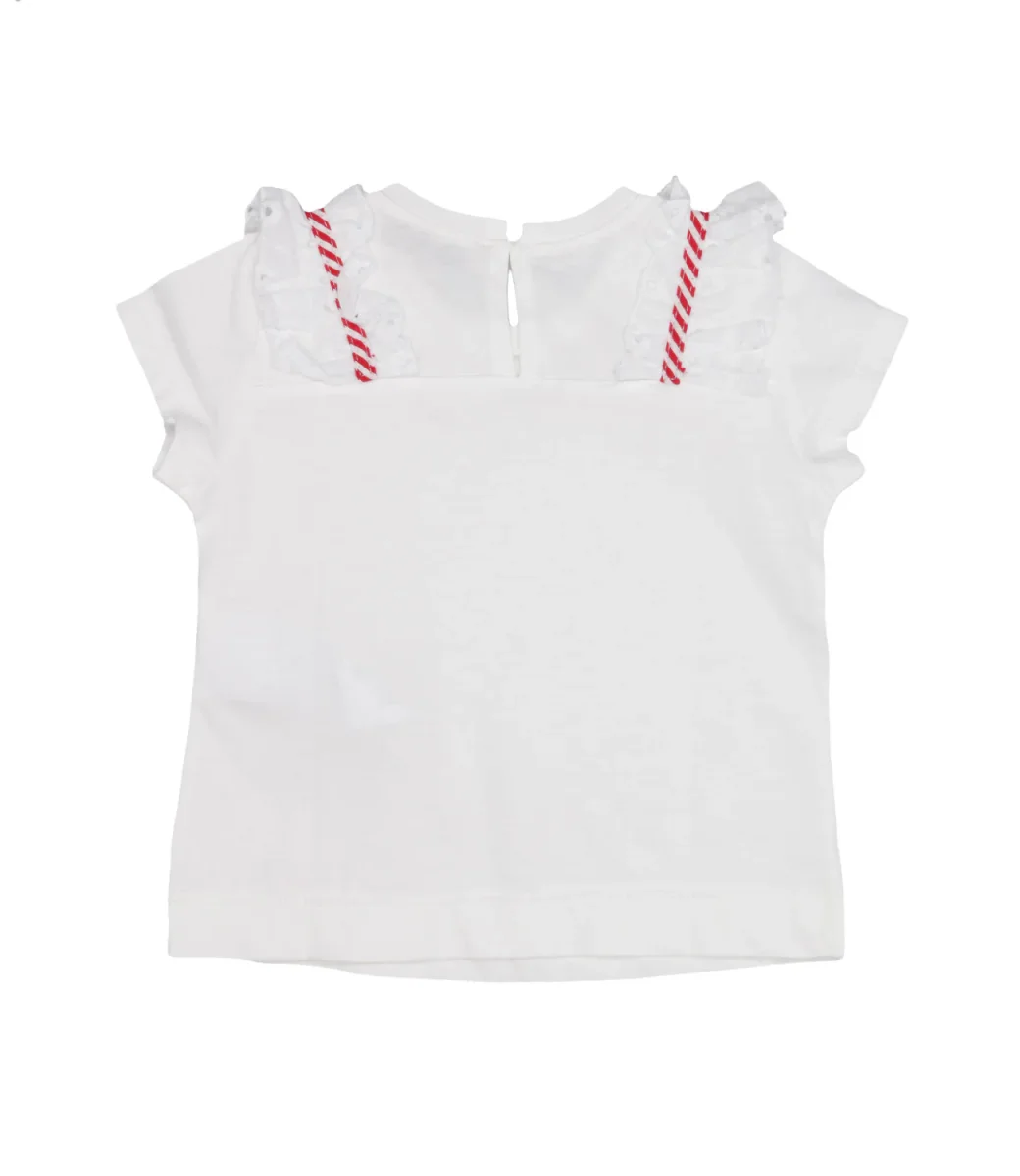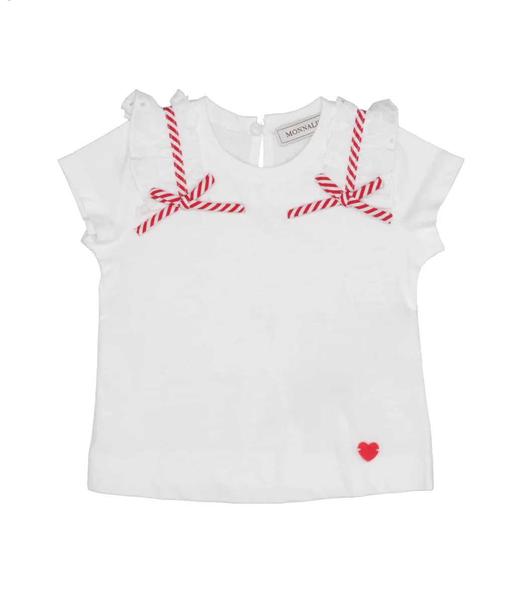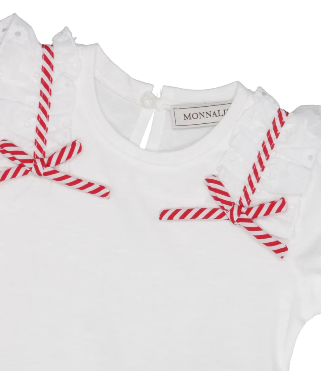 T-Shirt Monnalisa in jersey di cotone organico certificato GOTS e dettagli in sangallo e fiocchi rossi applicati sulle spalle e sul davanti. un design fresco e divertente pensato per le più piccole.