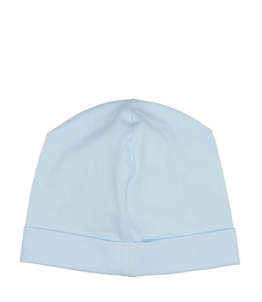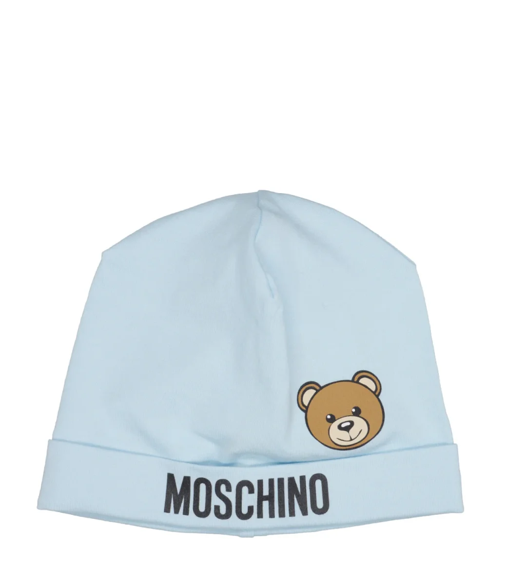 Cappello Moschino Baby in cotone, con stampa Teddy Bear sul laterale sinistro, risvolto con stampa logo lettering sul davanti.