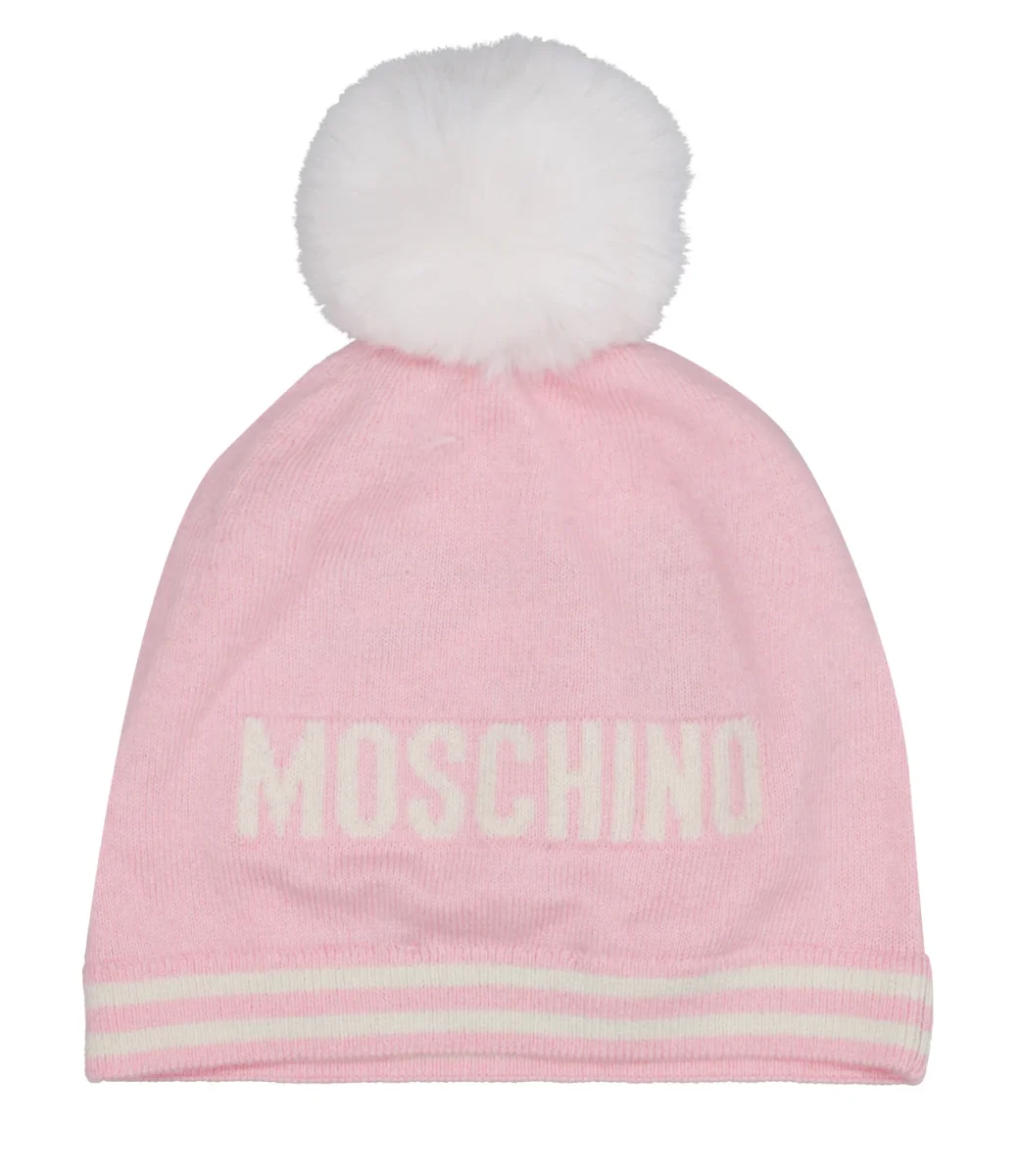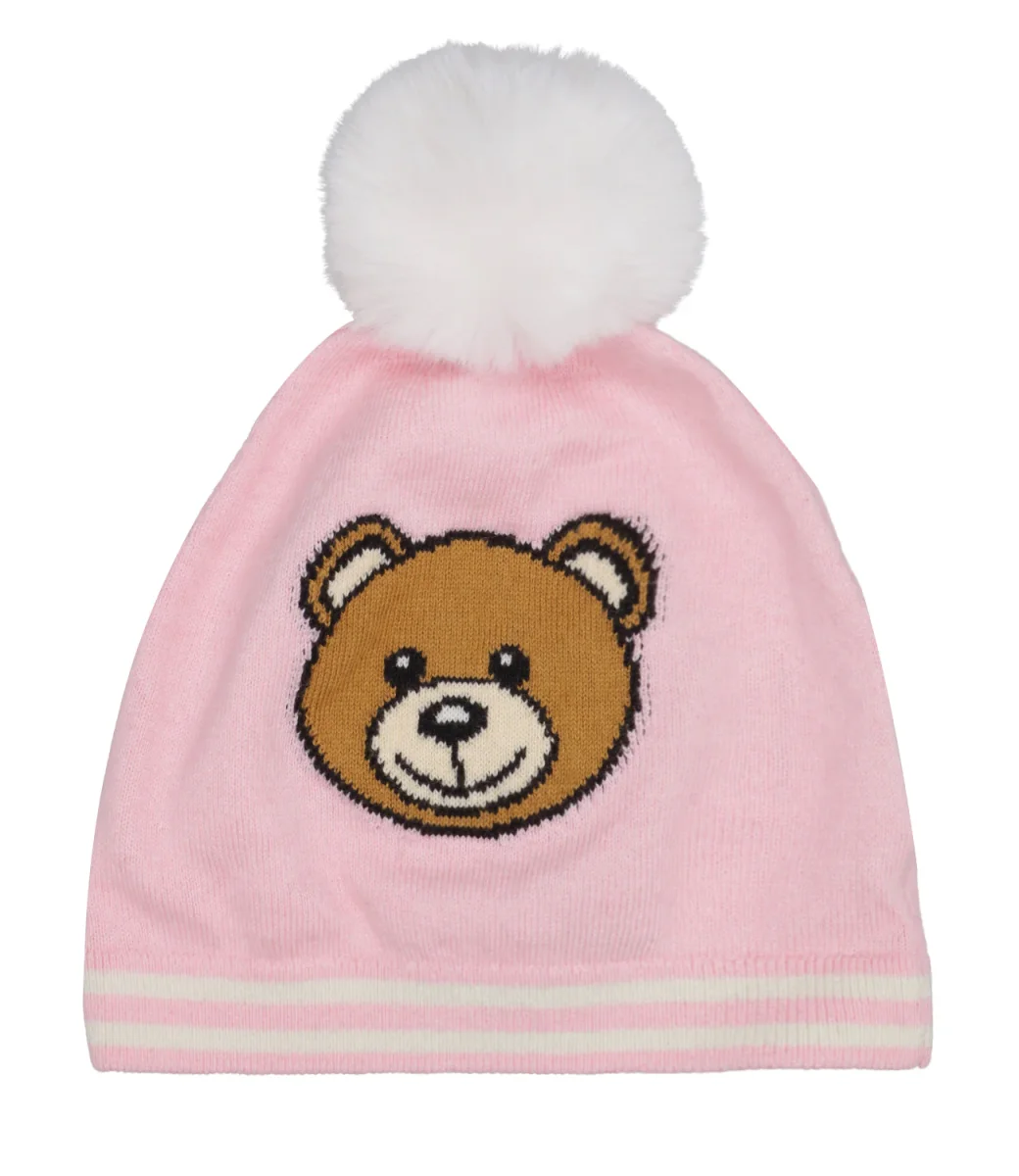 Cappello Moschino Baby in misto cotone, con motivo intarsiato da un lato Teddy Bear dall’altro logo, con ponpon in ecopelliccia, bordo con motivo righe orizzontali.