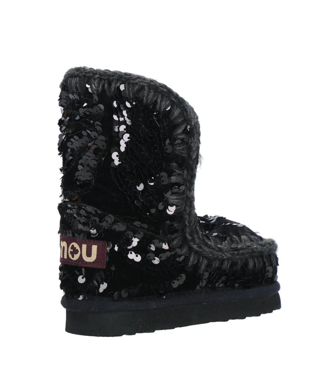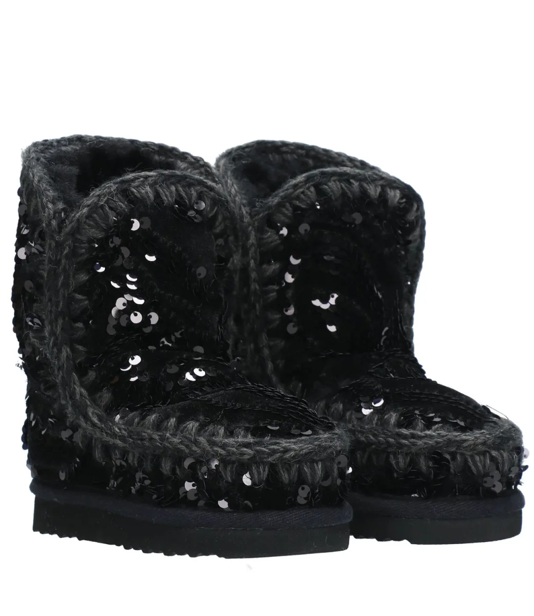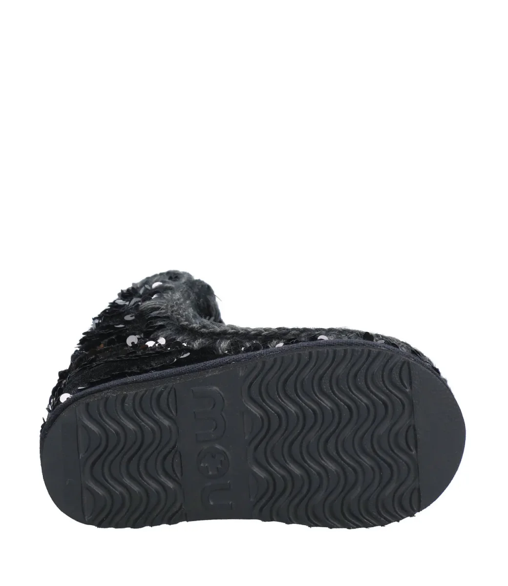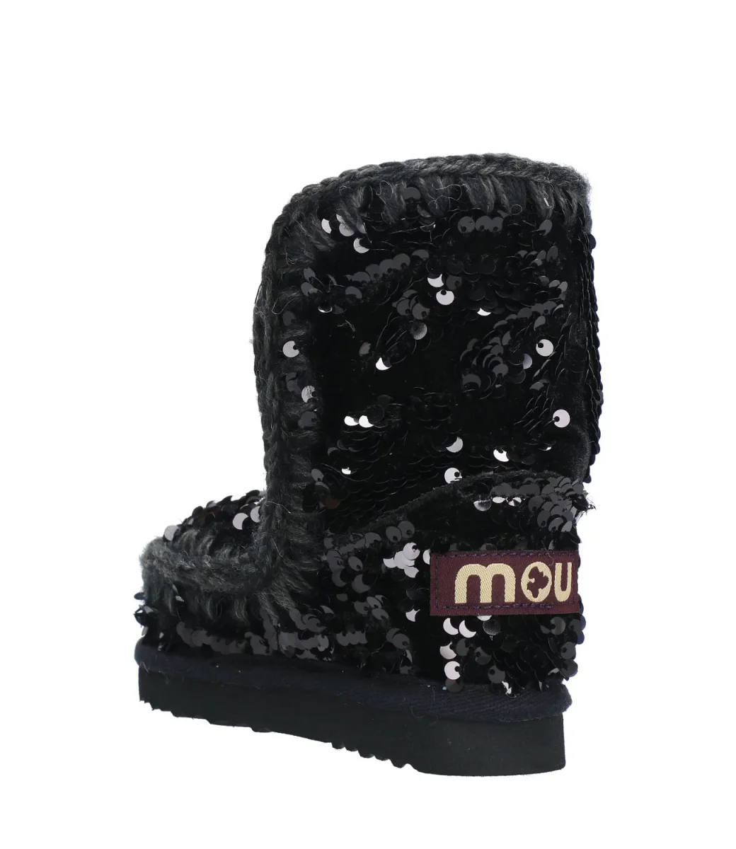 Tronchetto Mou Eskimo Kid Velvet Glamour Sequins realizzato con pelle di montone double-face estremamente calda, cuciture in lana all’uncinetto, tallone rinforzato e una suola esterna in EVA e gomma. Questa carinissima versione per bambini è disponibile con paillettes maxi. Logo patch sul retro