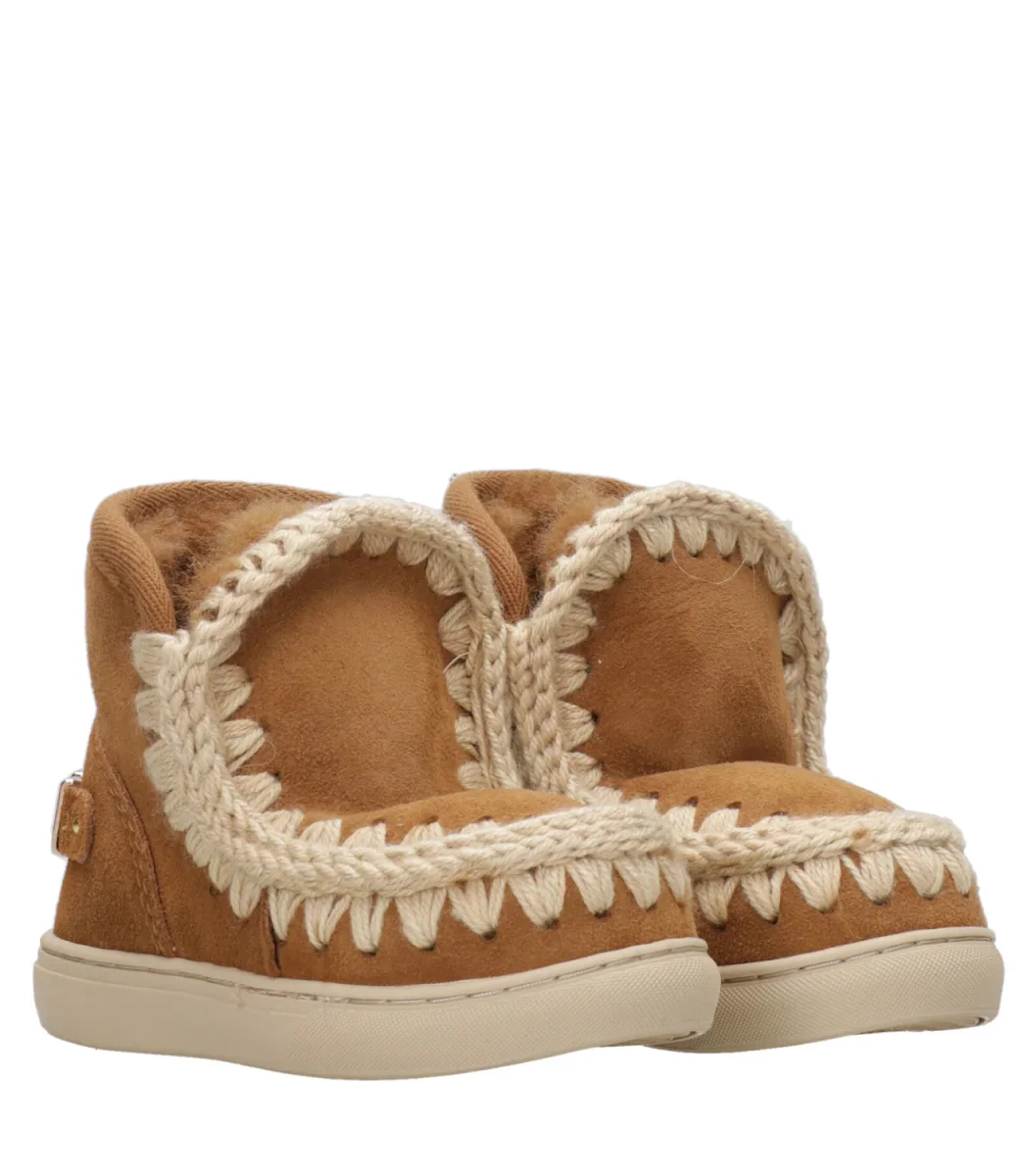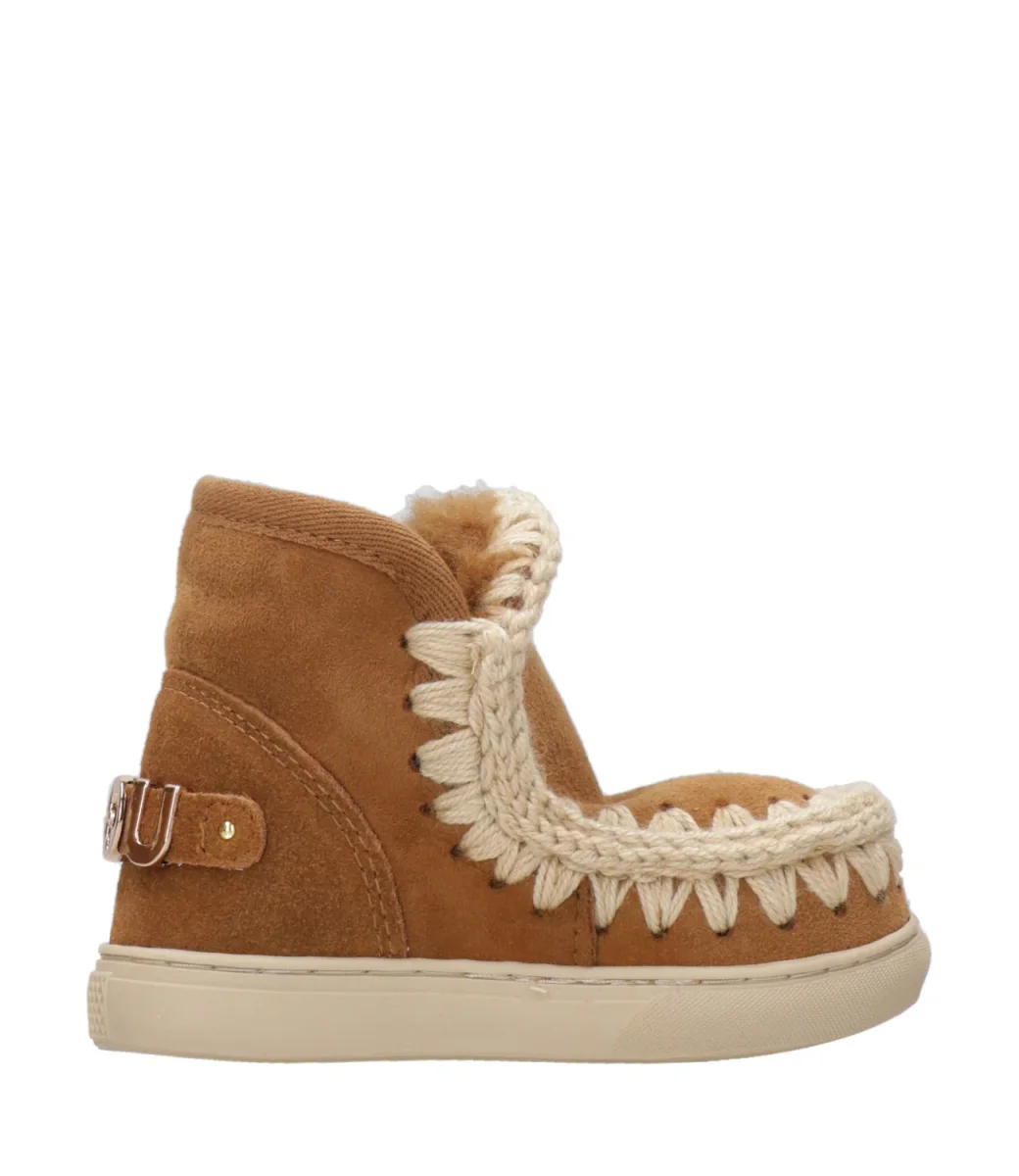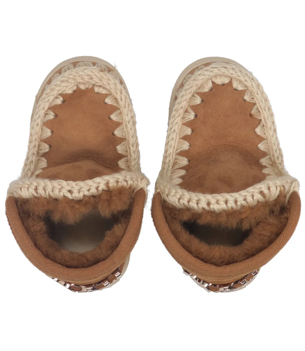 Tronchetto Mou Kids Bounce Slipper with Back Strap realizzato a mano in pelle di montone double face con iconiche cuciture in lana distintive del brand, logo in metallo e suola in gomma.