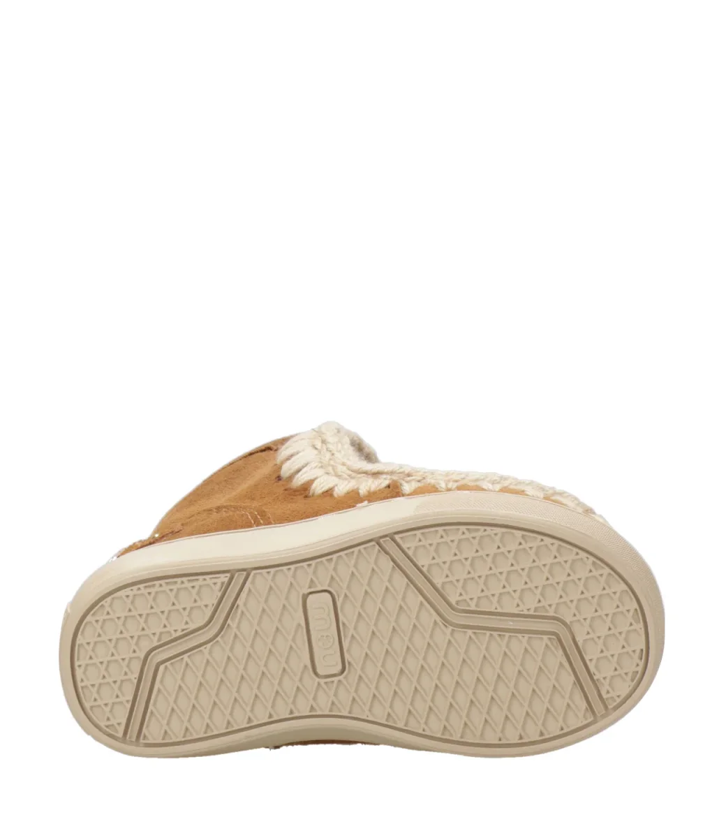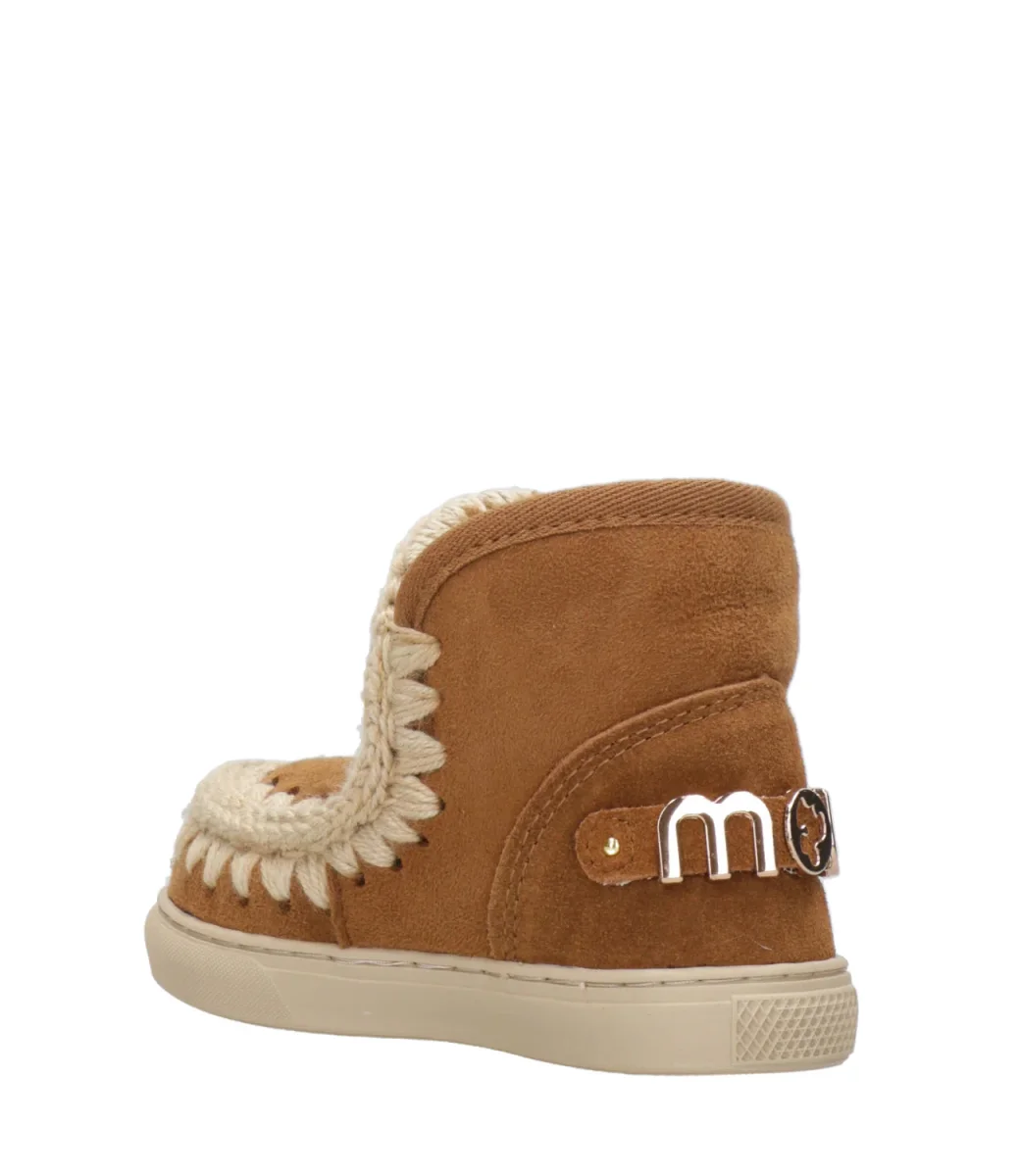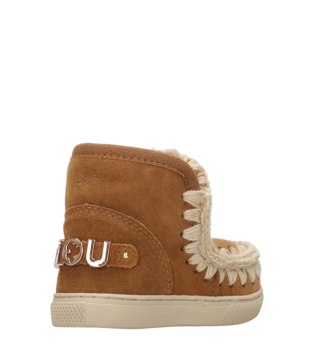 Tronchetto Mou Kids Bounce Slipper with Back Strap realizzato a mano in pelle di montone double face con iconiche cuciture in lana distintive del brand, logo in metallo e suola in gomma.