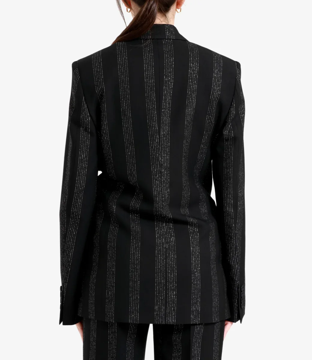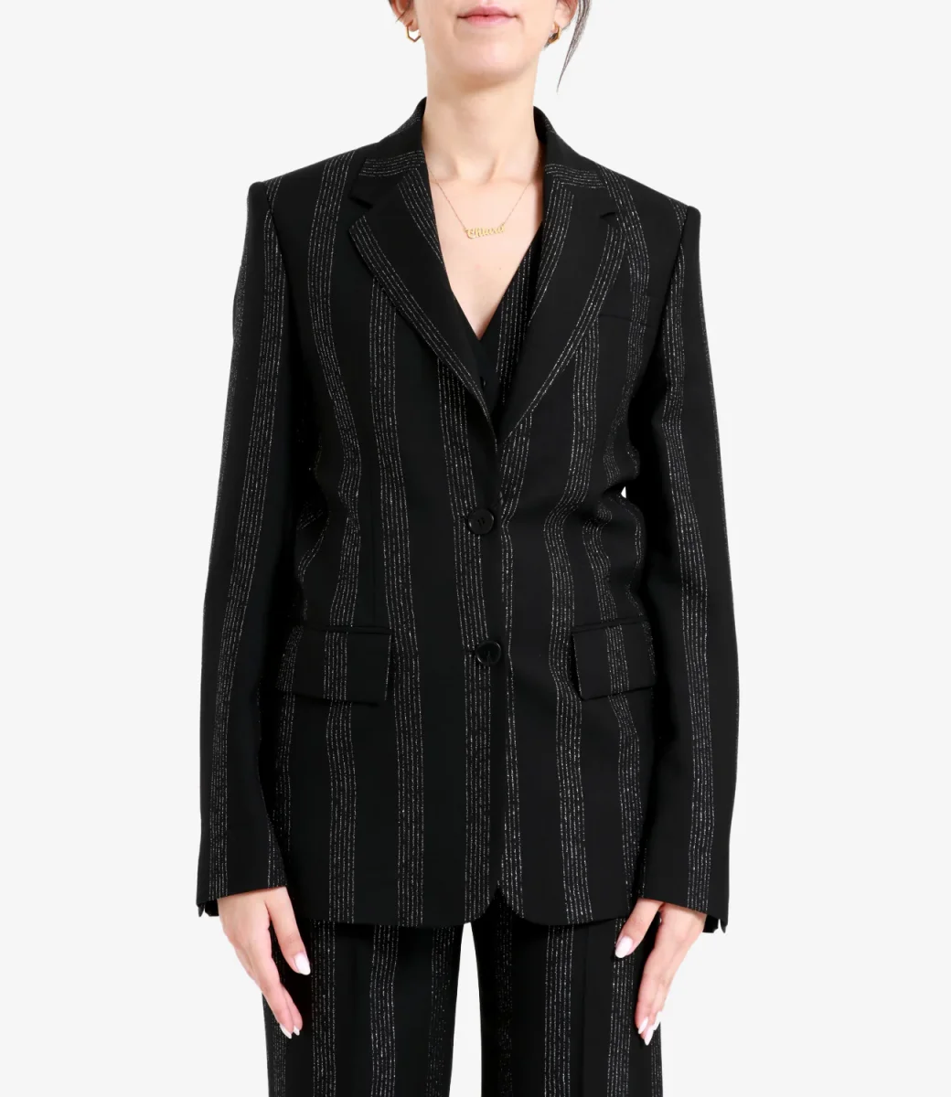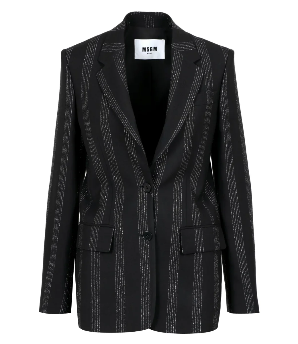 Giacca MSGM dal taglio sartoriale realizzata in tessuto di lana vergine gessato arricchito da fili lurex. Chiusura monopetto a due bottoni, spalle imbottite, revers classico, un taschino sul petto e due tasche con patta sul davanti. Vestibilità regular.