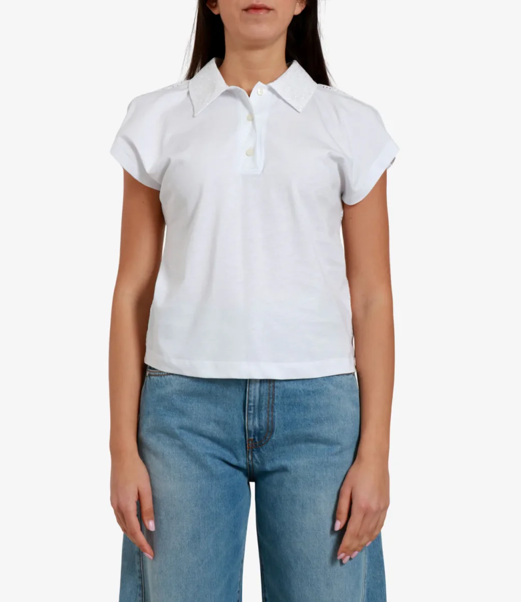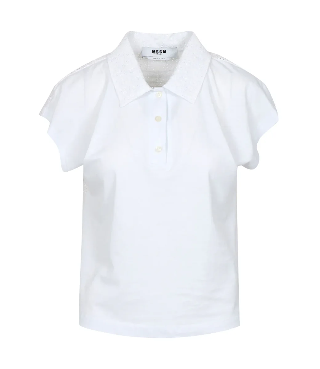 T-Shirt MSGM in cotone con costruzione a due pannelli. Modello a polo con manica a sbuffo, sulla schiena tessuto in pizzo traforato. Slihouette dal taglio dritto e spalle scese per massima libertà.