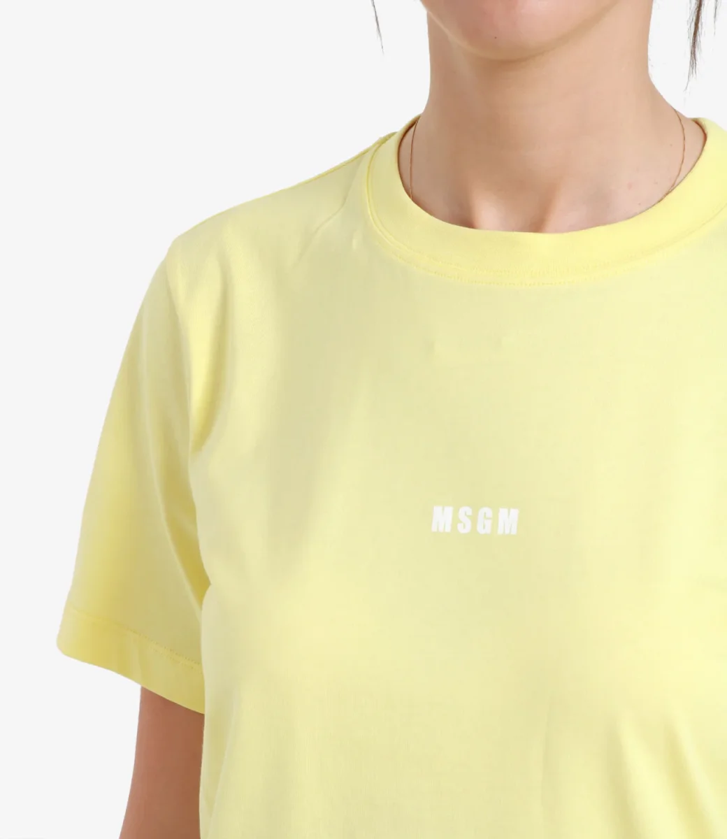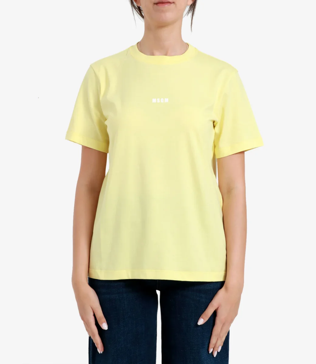 T-Shirt MSGM in cotone giallo, girocollo, maniche corte, con logo lettering sul davanti, bordo dritto, vestibilità regolare