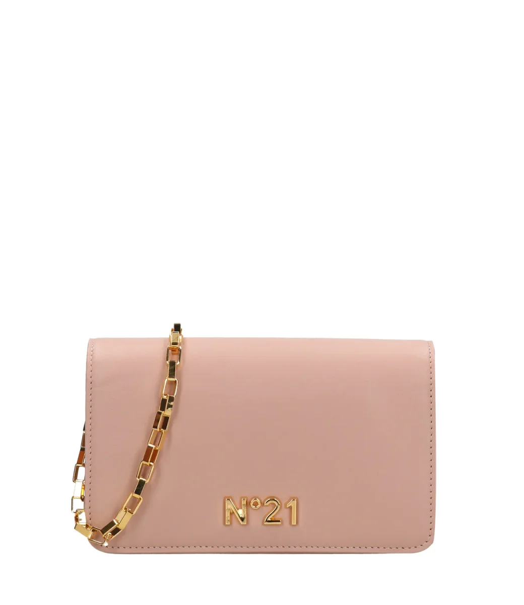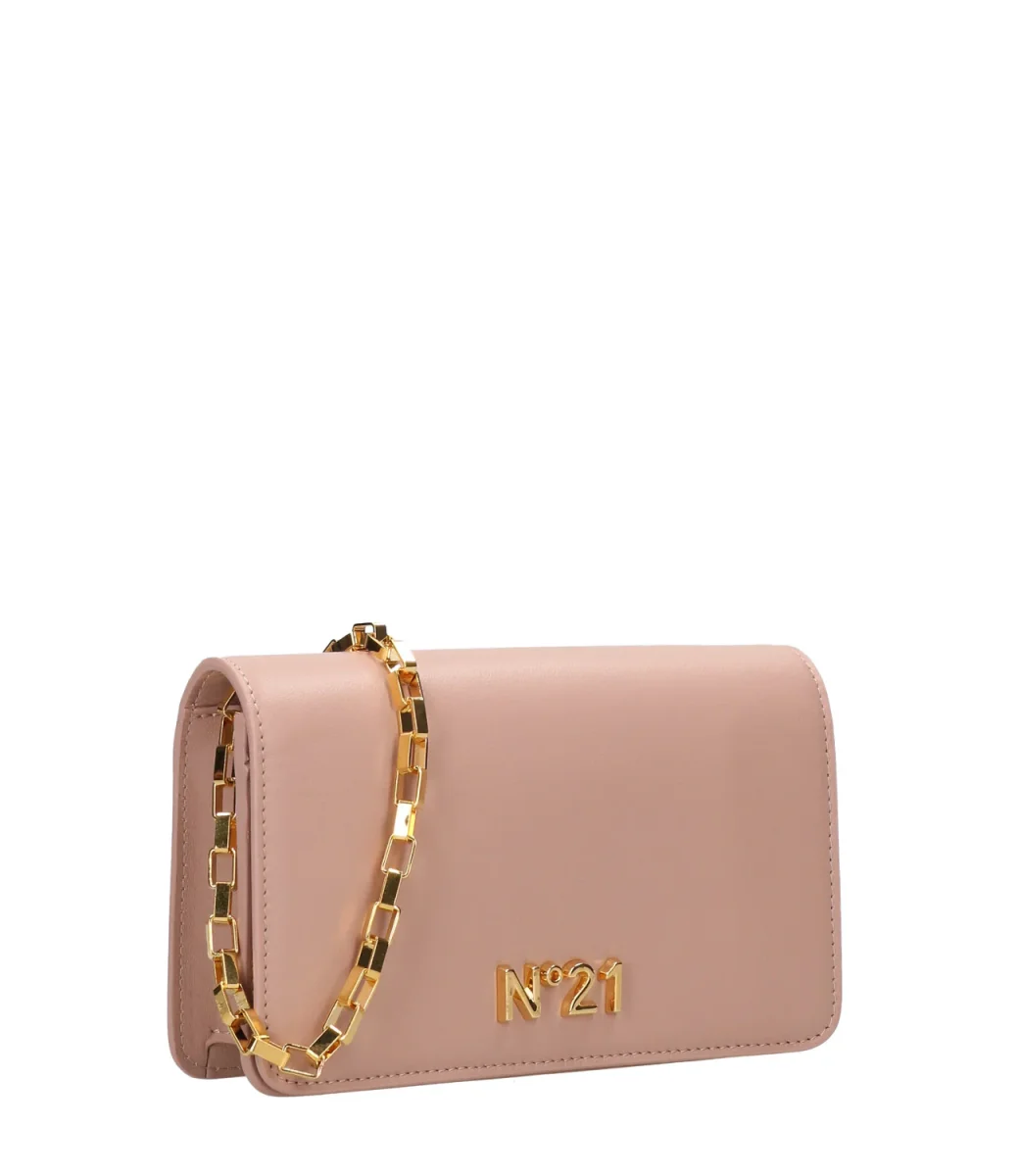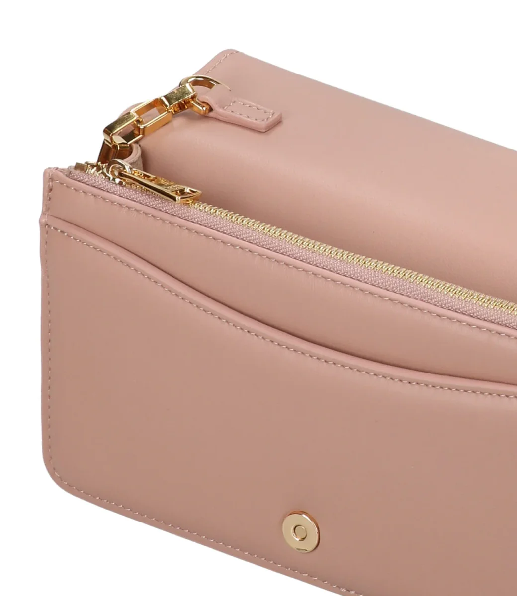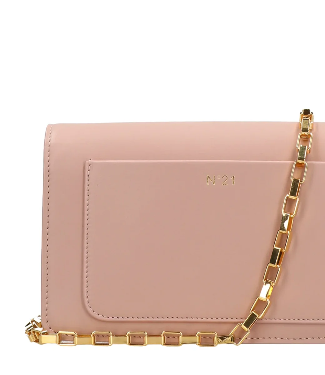 Borsa modello a portafoglio in pelle color rosa nudo con placca con logo di colore oro sul davanti. Tracolla a catena rimovibile.