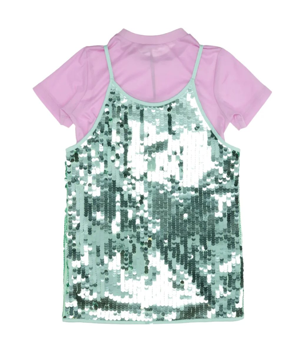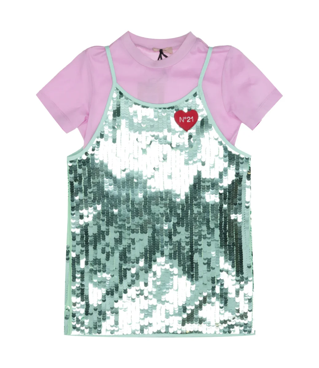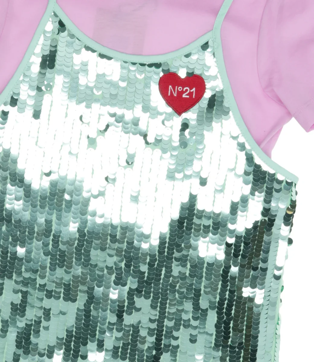 Abito N 21 Kids verde acqua in cotone e paillettes, composto da T-Shirt girocollo, con maniche corte, top in paillettes con spalline sottili, patch cuore con logo N21 ricamato davanti lato sinistro, orlo dritto, vestibilità regolare