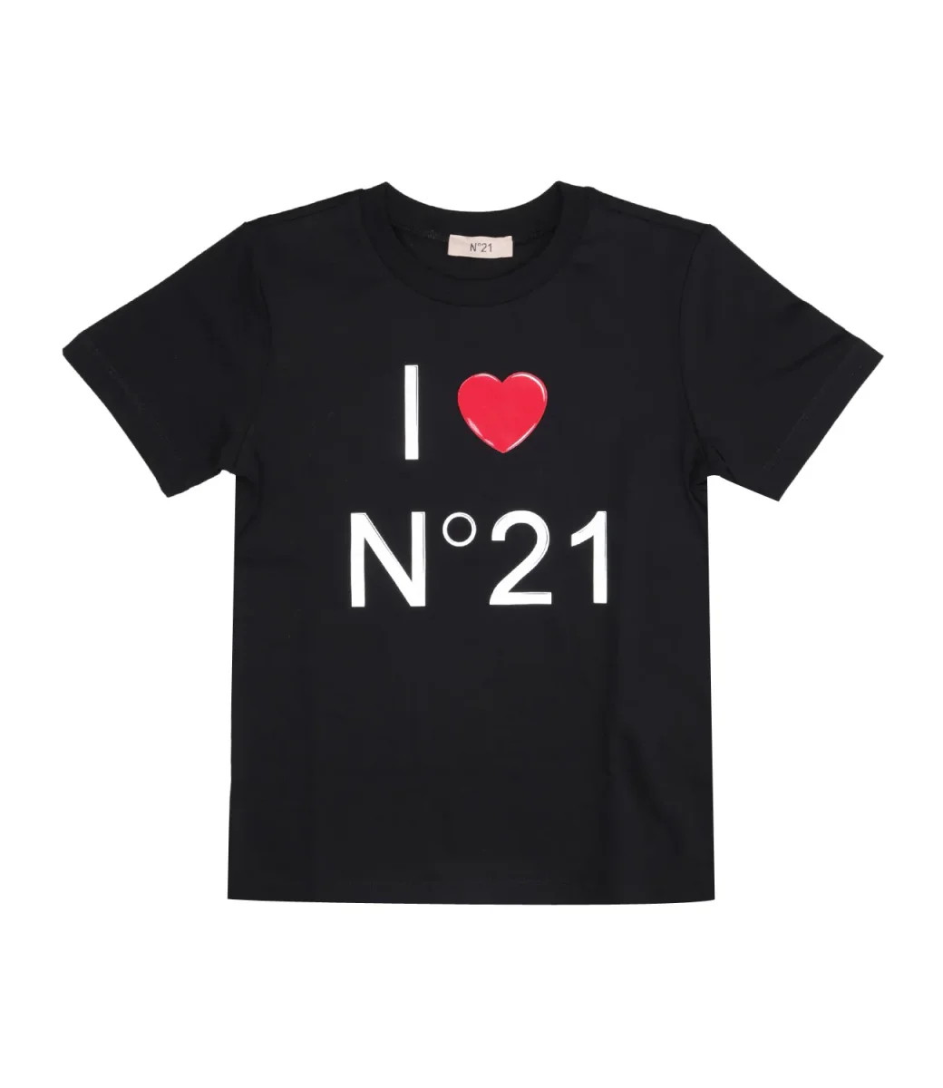 Maglia in cotone nero con logo N 21 frontale, collo a girocollo e maniche corte.