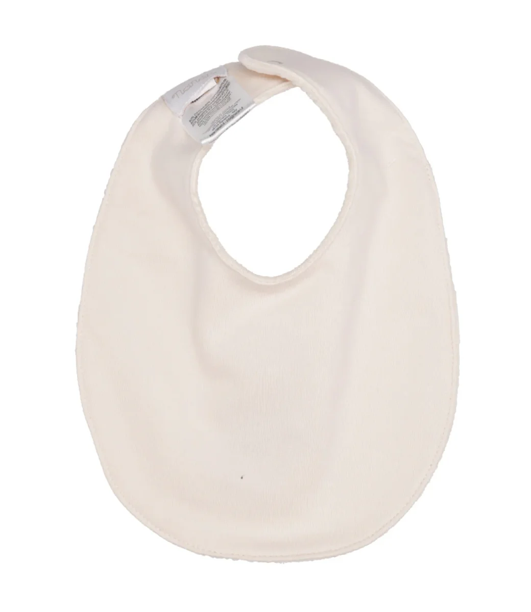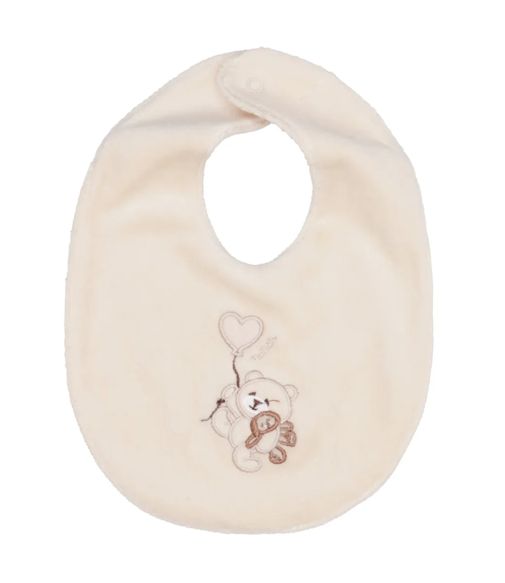 Bavaglino Nanan in ciniglia di cotone, impreziosito sul fronte da un orsetto ricamato, chiusura sul retro del collo con bottoncino automatico.