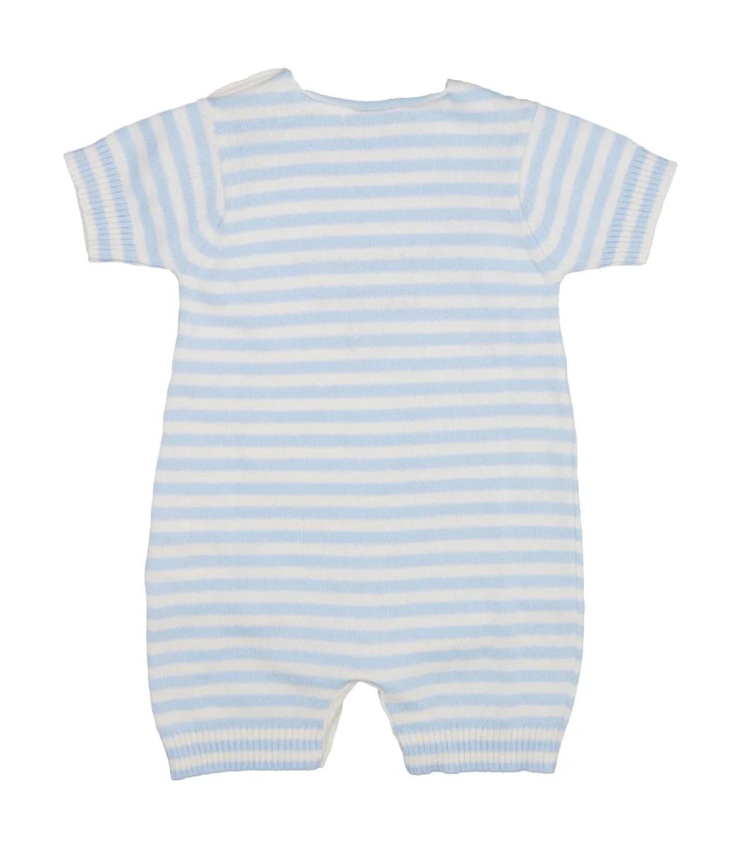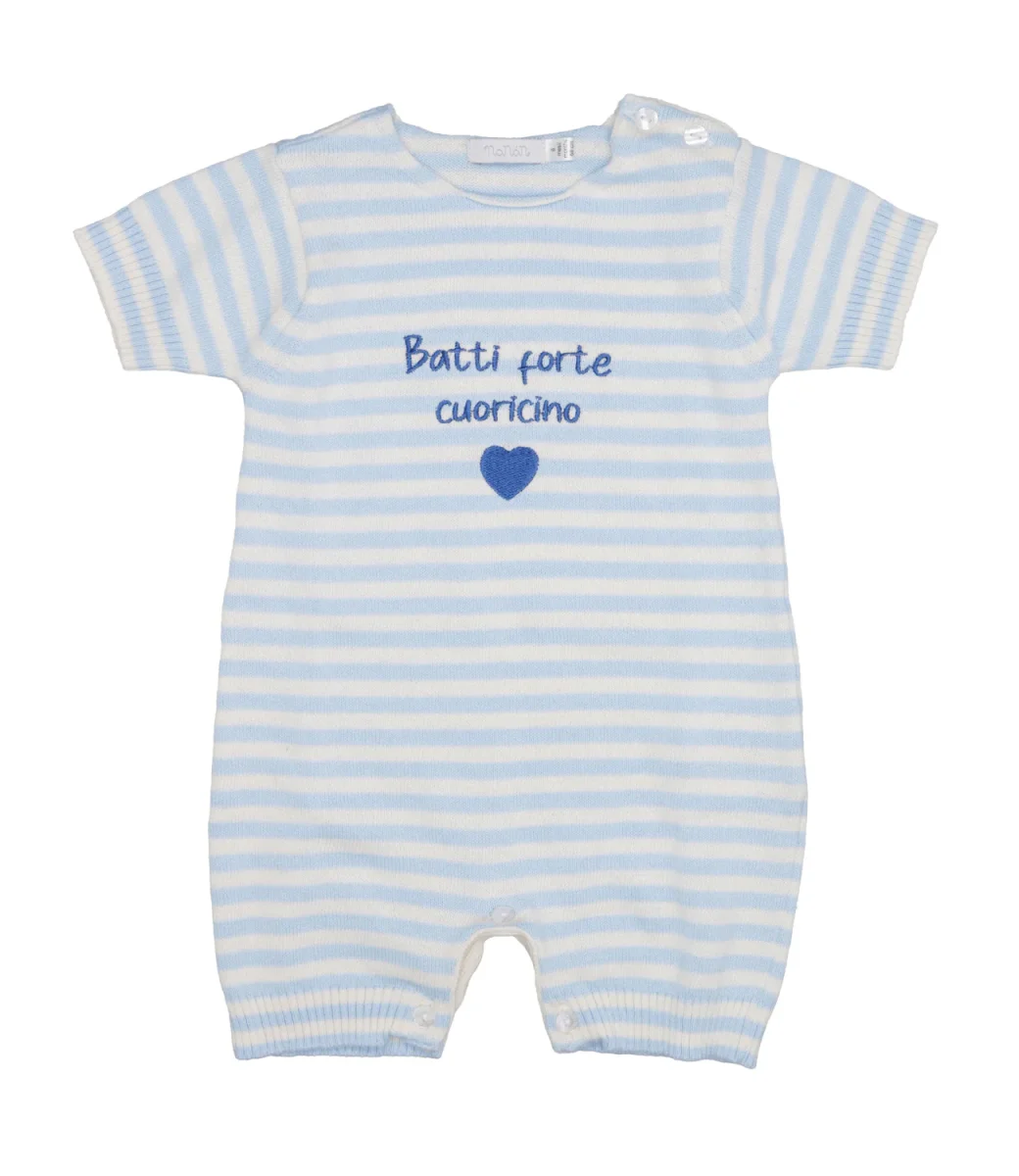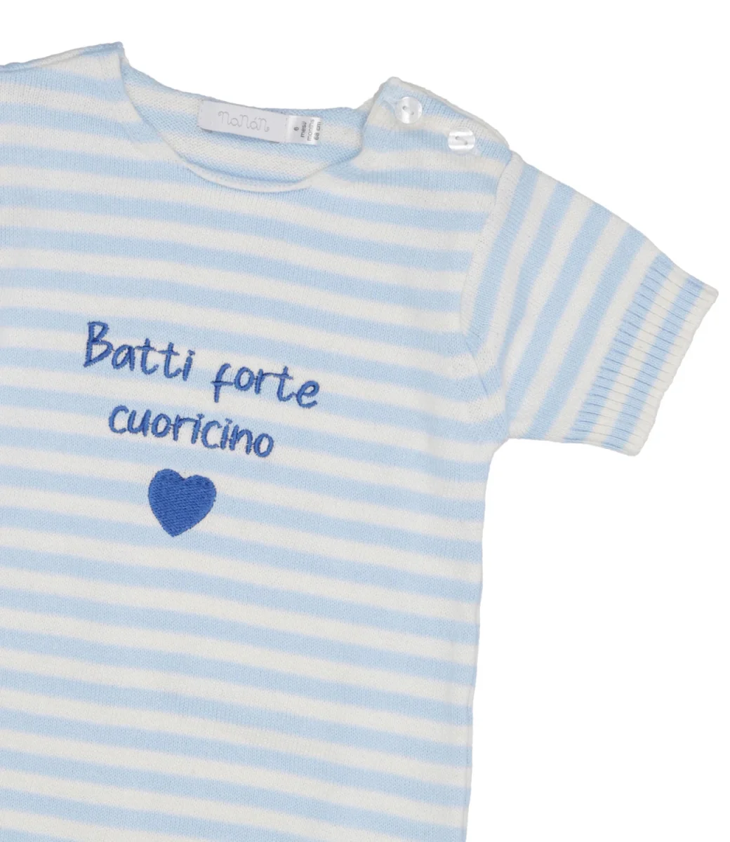 Pagliaccetto Nanan in cotone con fantasia a righe bianca e azzurra, girocollo, maniche corte, scritta “Batti forte cuoricino” sulla parte frontale, abbottonatira posteriore e inferiore con bottoni automatici.