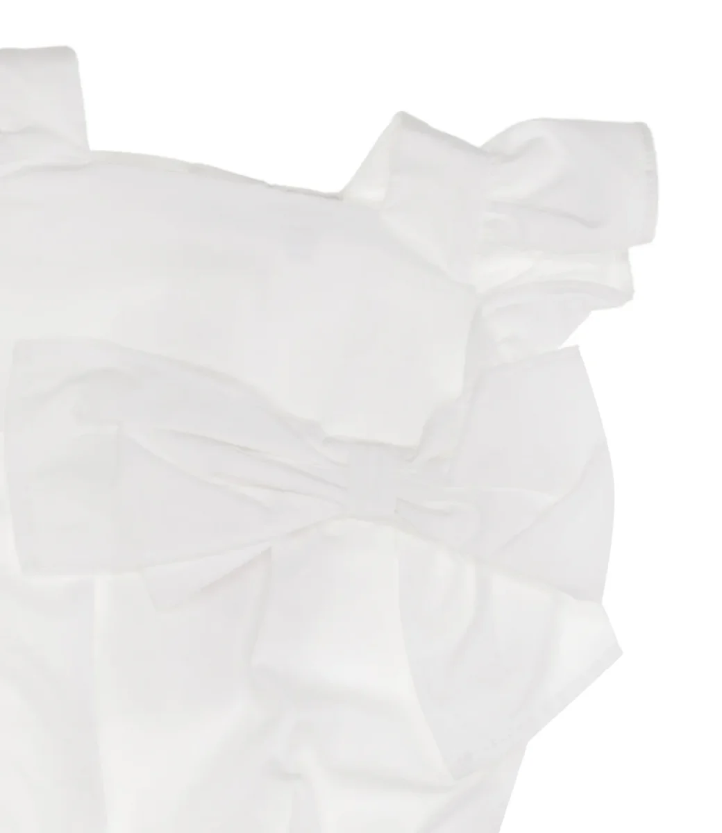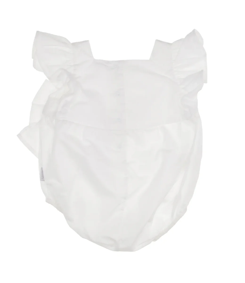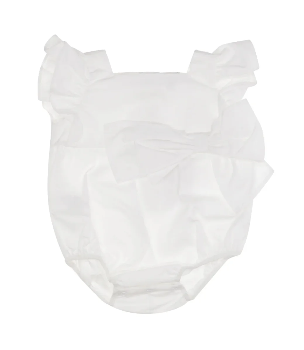 Pagliaccetto Nanan in popeline di cotone bianco con grasioso fiocco in vita e reso particolare dalle mezze maniche con voulant. Adatto per accompagnare la tua dolce bimba durante le fresche giornate estive donandole eleganza e comodità.