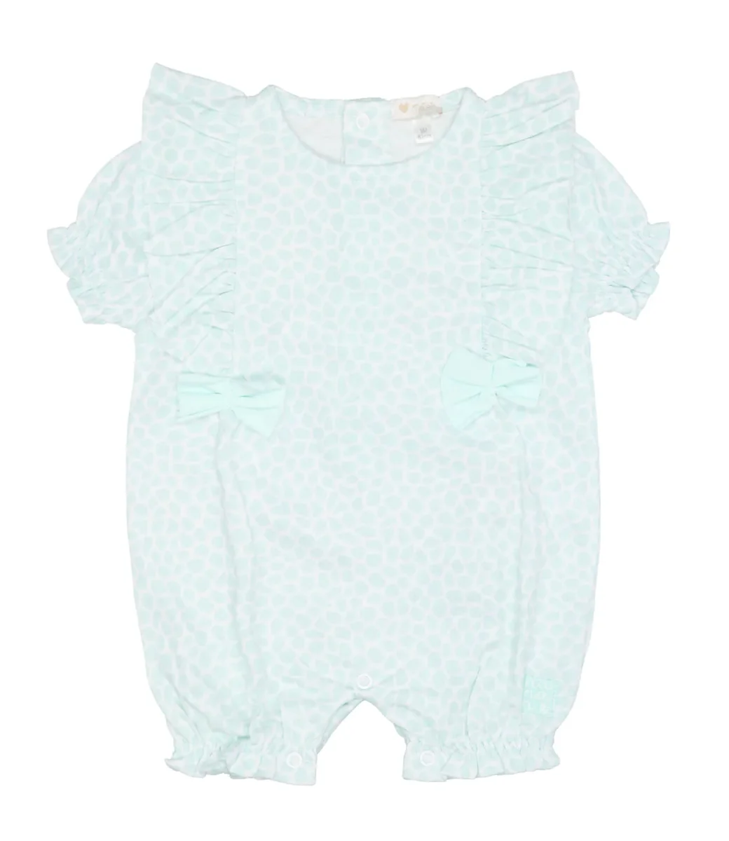 Pagliaccetto Nanan in cotone con stampa animalier, girocollo, volant su entrambe le spalle, fiocchetti sulla parte frontale, orlo elasticizzato, chiusura posteriore con bottoni automatici.