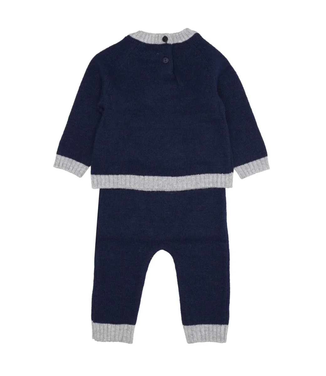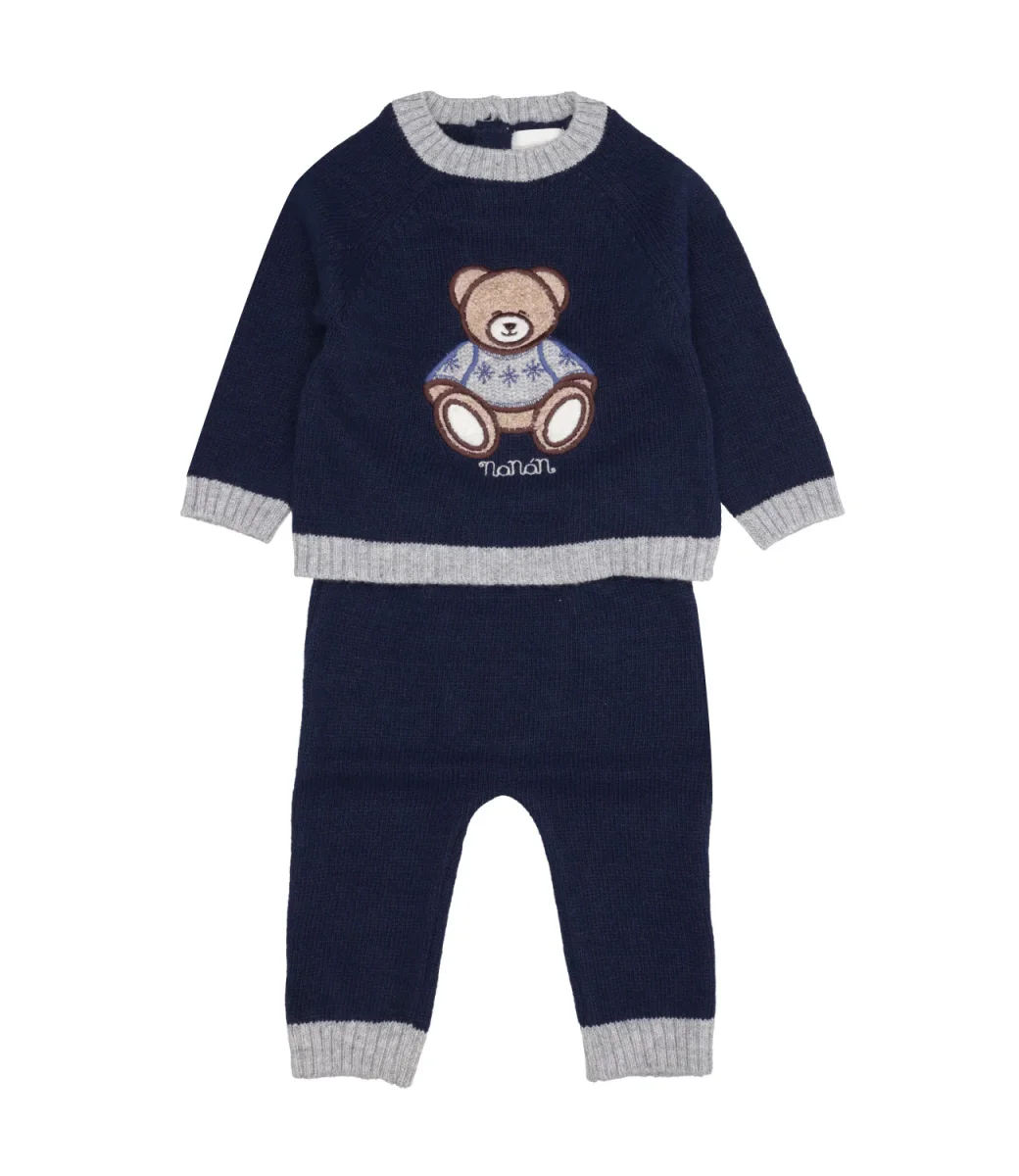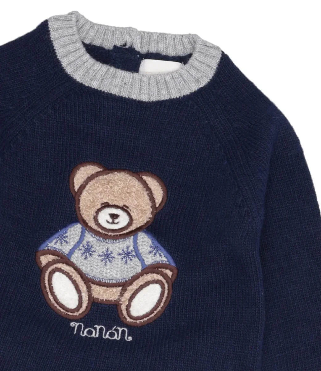 Set Maglia e Pantalone Nanan in misto lana, maglia con girocollo a coste, con orsetto ricamato sul davanti, maniche lunghe con polsini a coste, fondo con bordo a coste, chisura sul retro con automatici. Pantalone in misto lana con vita elasticizzata e polsini a coste