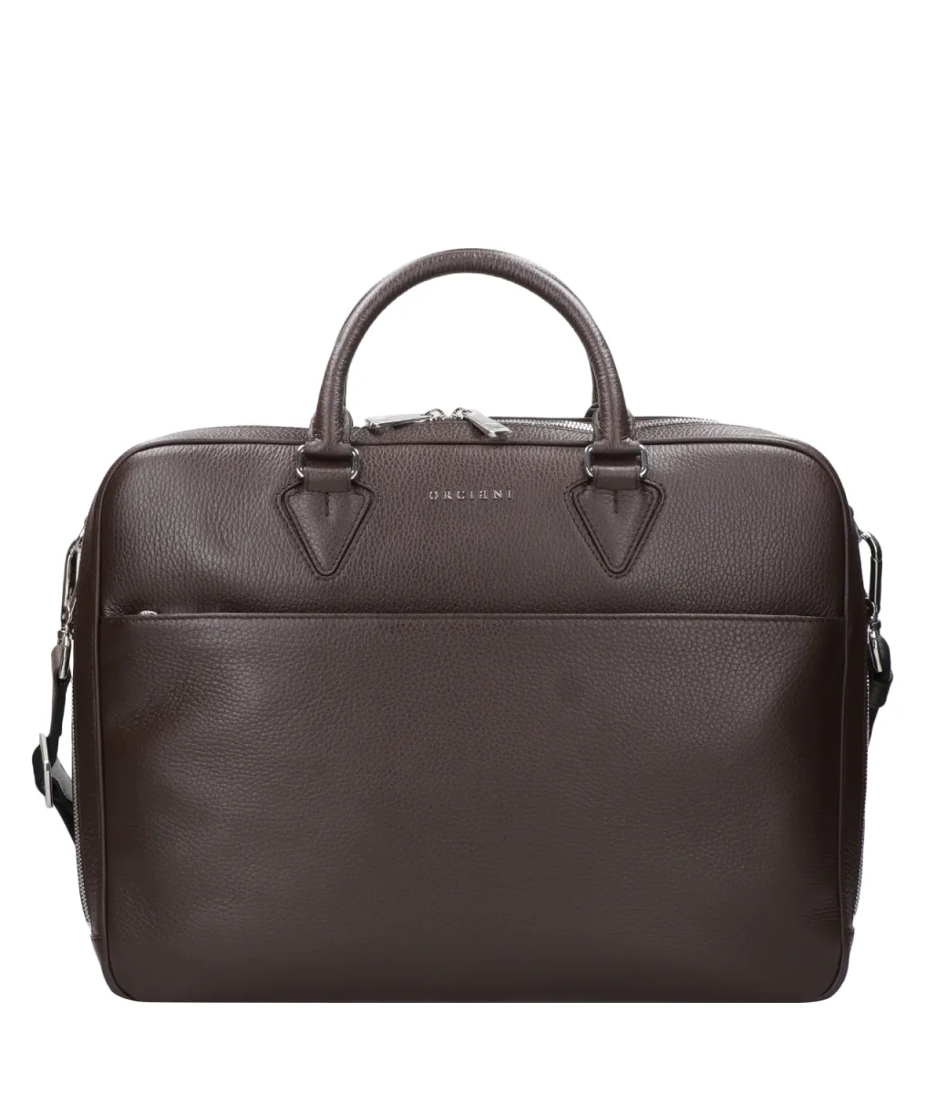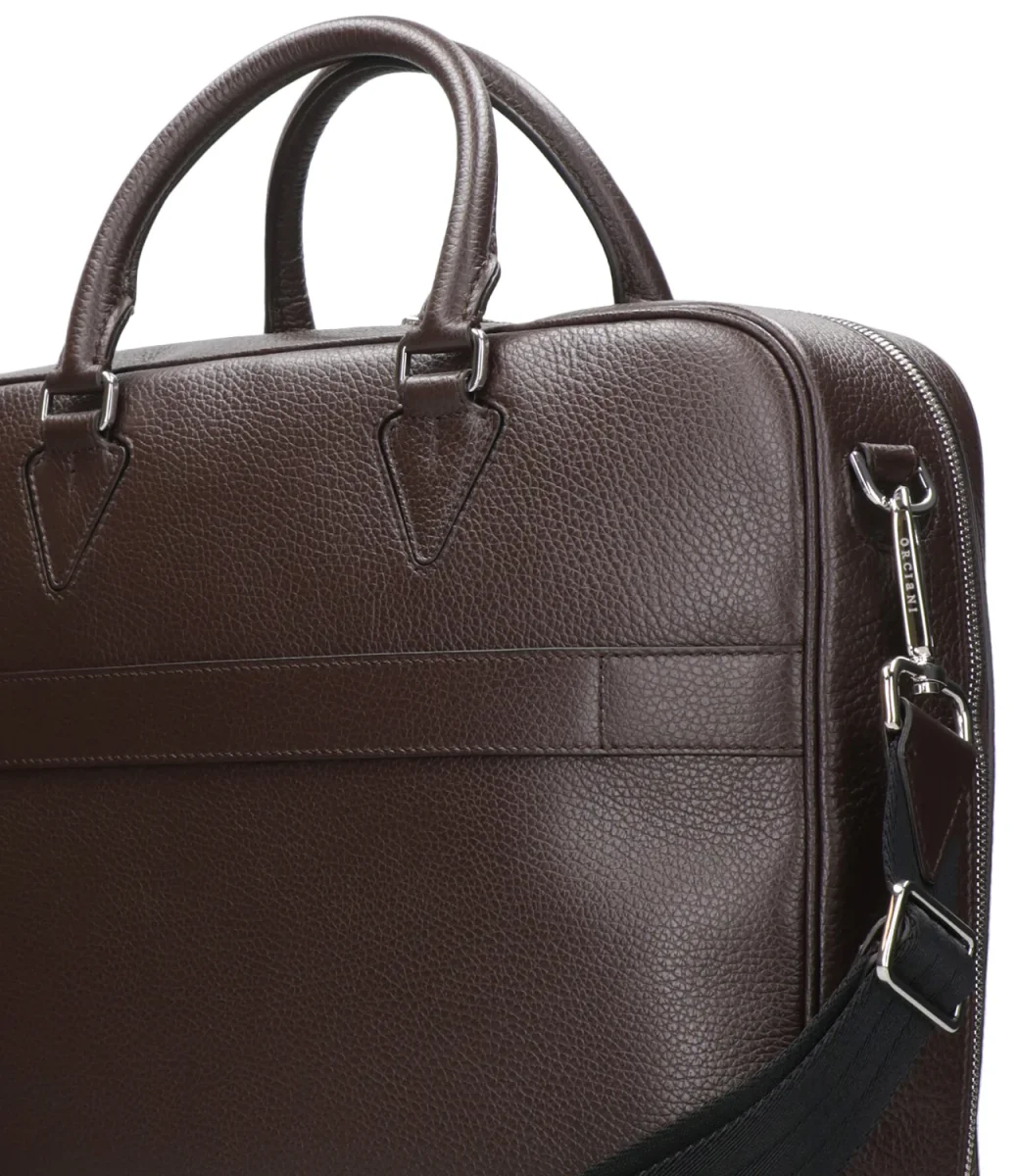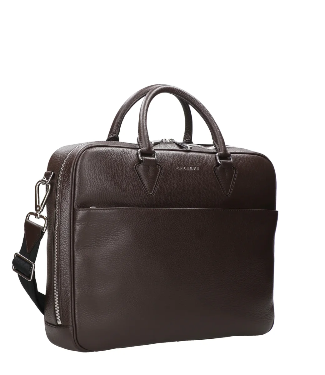 Borsa Orciani modello Business slim Timeless in pelle palmellata, con manici corti, chiusura con zip, tracolla regolabile e removibile, con dettagli in finitura palladio. Made in Italy