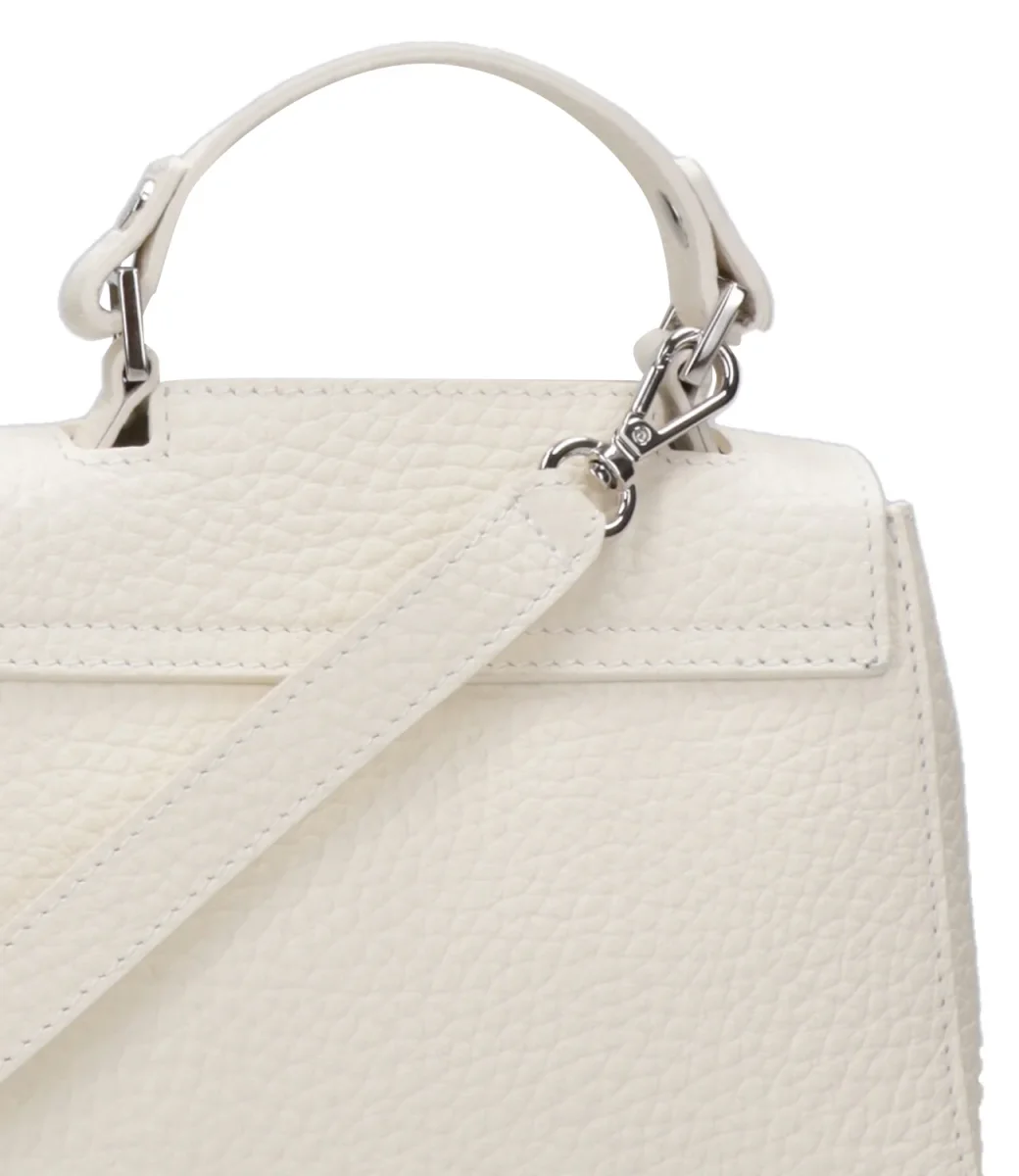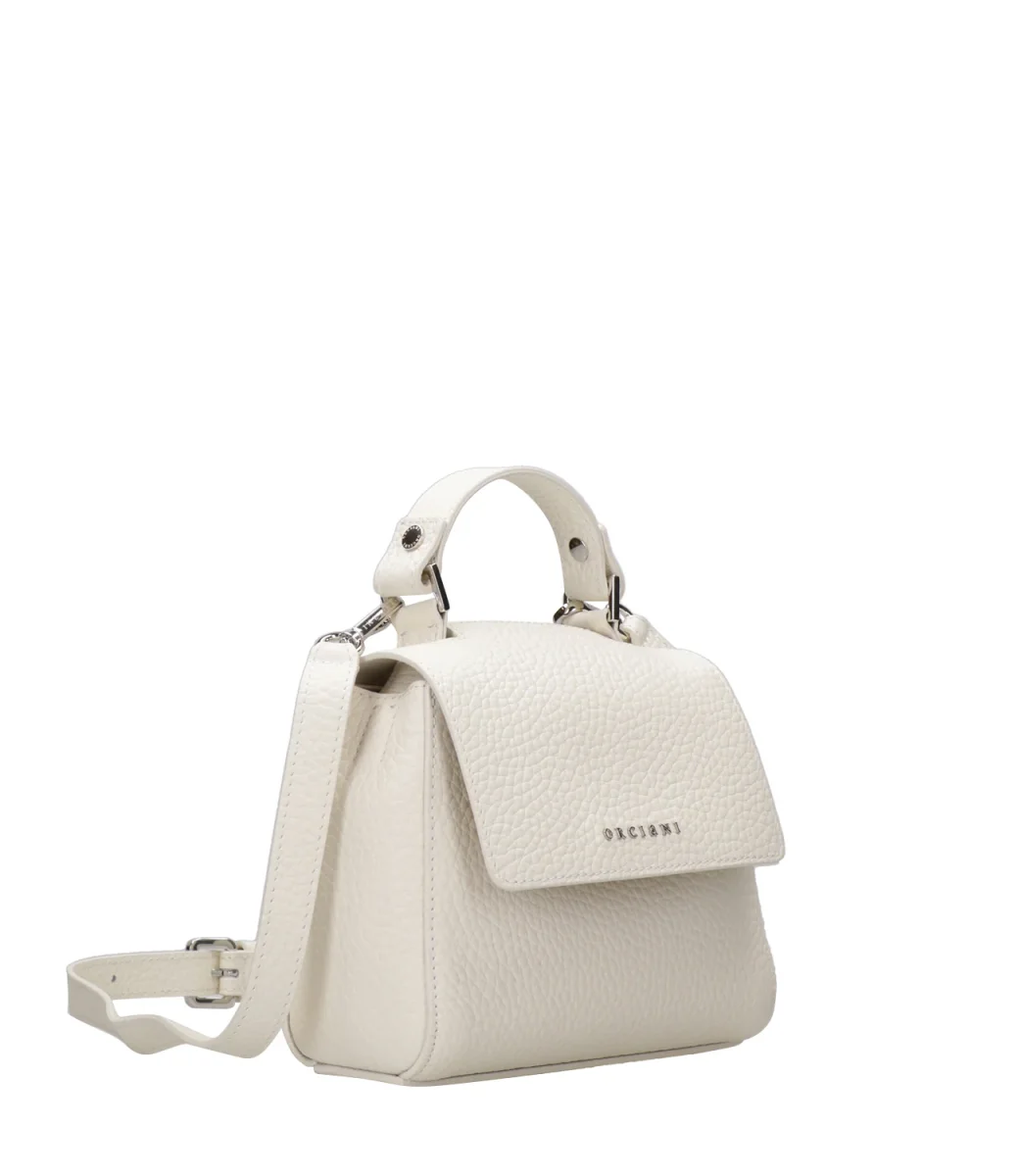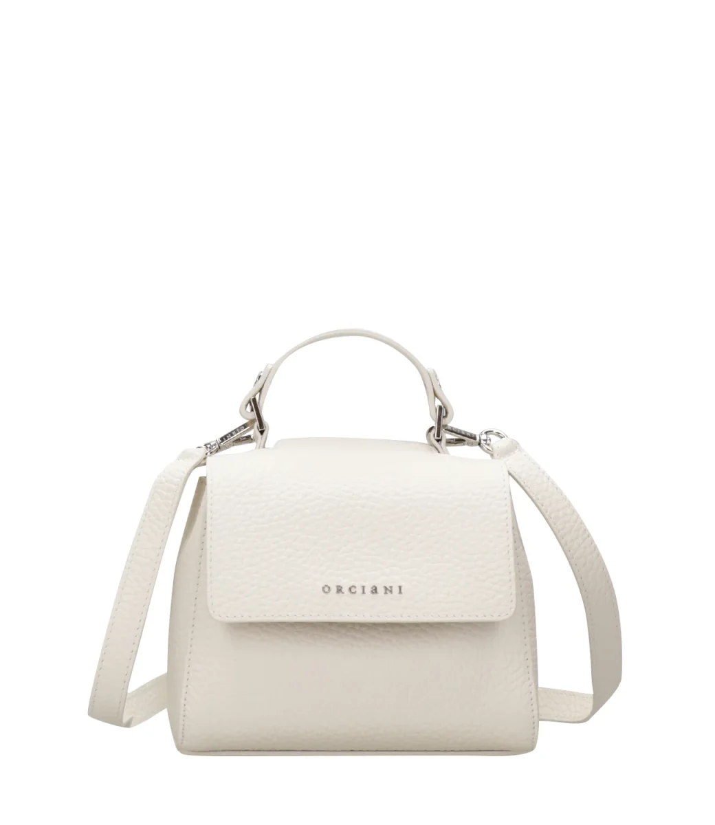 Borsa Orciani Sveva Mini in pelle bovina, modello da indossare a mano o con la tracolla regolabile con fibbia e rimovibile, manico fisso in pelle sul bordo superiore, fessura a scomparsa per accedere all’interno della borsa senza aprirne la patta, tasca interna con zip. Chiusura con patta e magnete, logo lettering in finitura palladio.