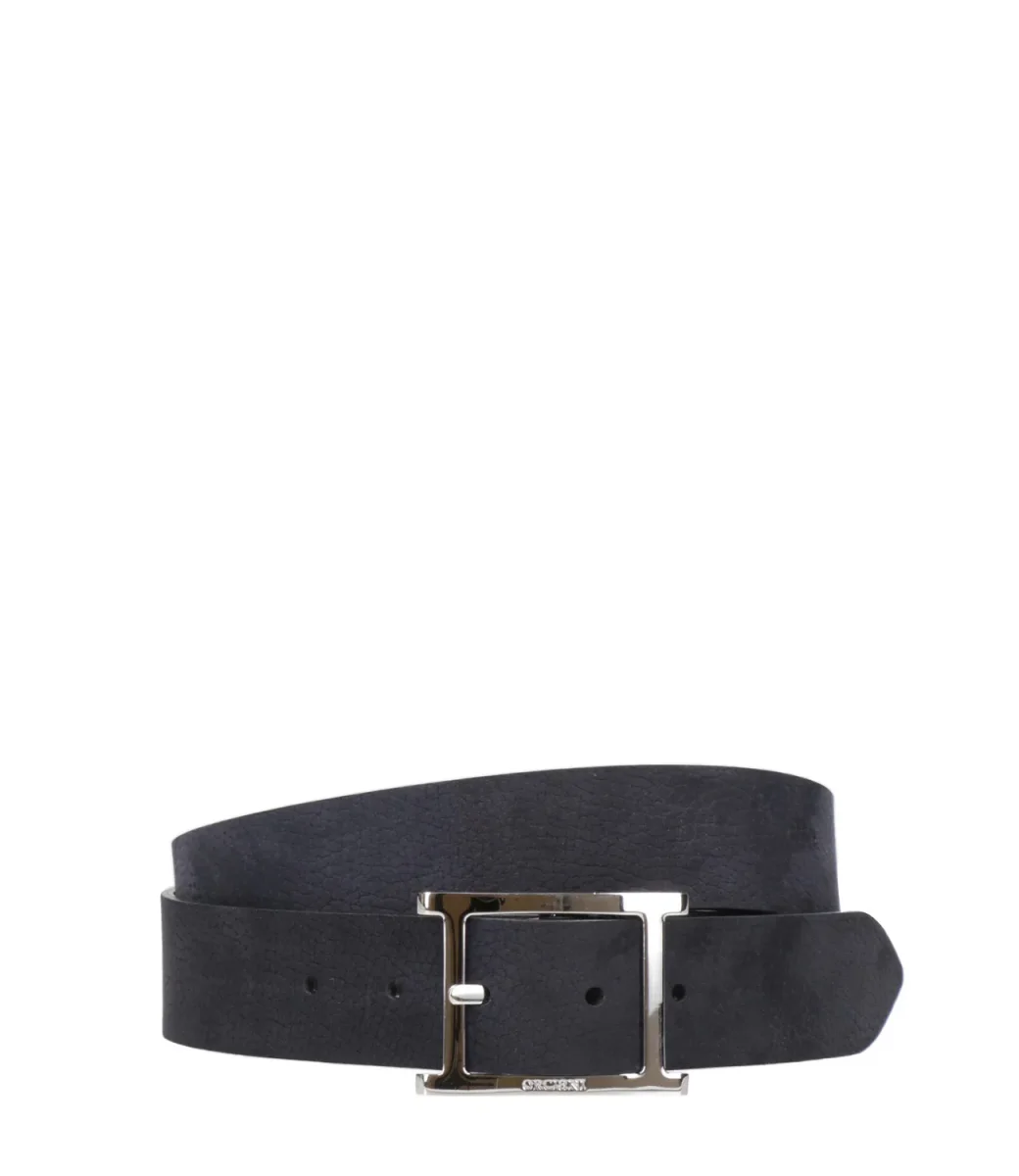 Cinta Orciani realizzata in pelle scamosciata e pelle liscia, con fibbia logata in metallo argentato, accessori da poter abbinare a qualsiasi look.