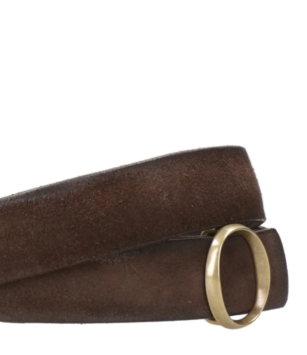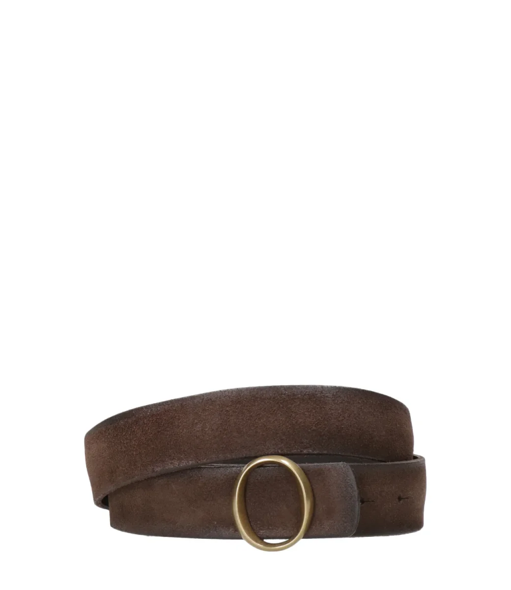 Cinta Orciani in suede e pelle, fibbia monogram in finitura ottone lucido. Un accessorio per un guardaroba di stile.
