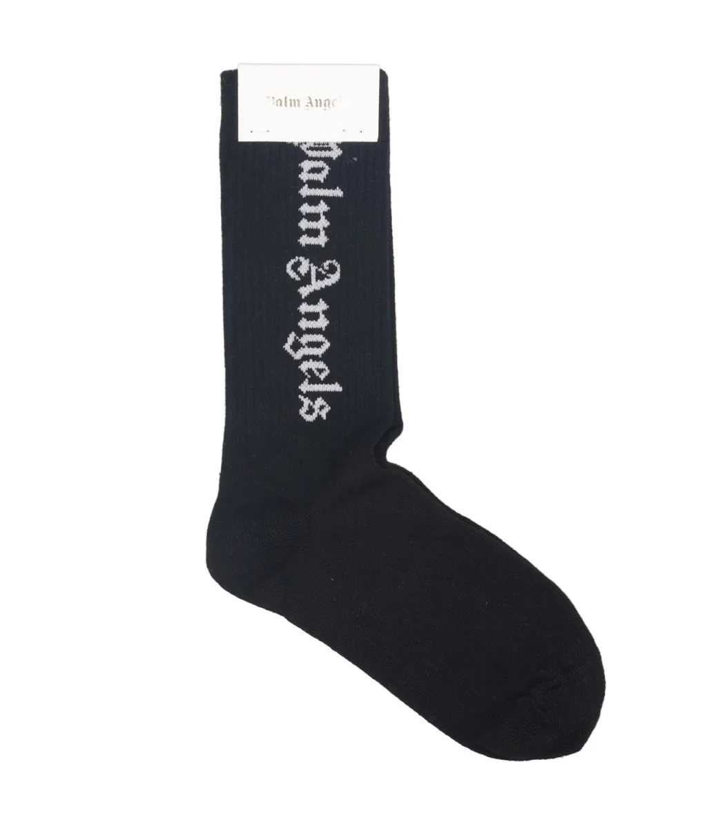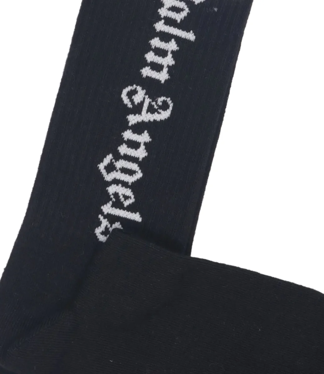 Calzini Palm Angels Kids High realizzati in tessuto di cotone con costruzione tubolare a gambale lungo in coste e logo lettering Palm Angels jacquard in verticale.