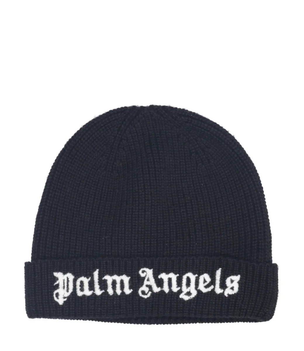 Cappello Palm Angels Kids Logo in misto lana e cashmere a coste con risvolto e logo ricamato in evidenz sul davanti, dal look streetwear, vestibilità aderente.