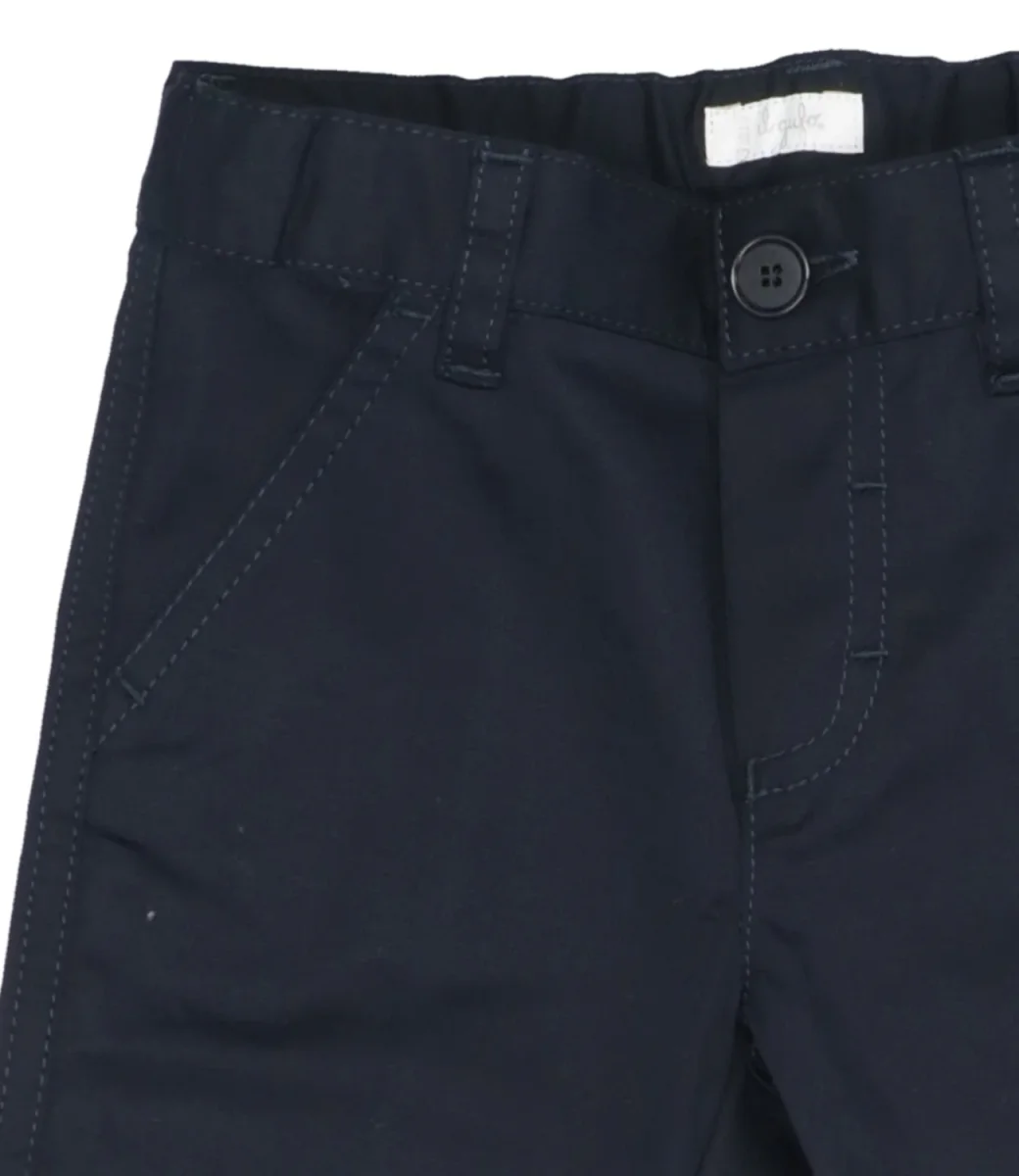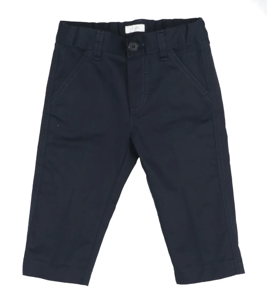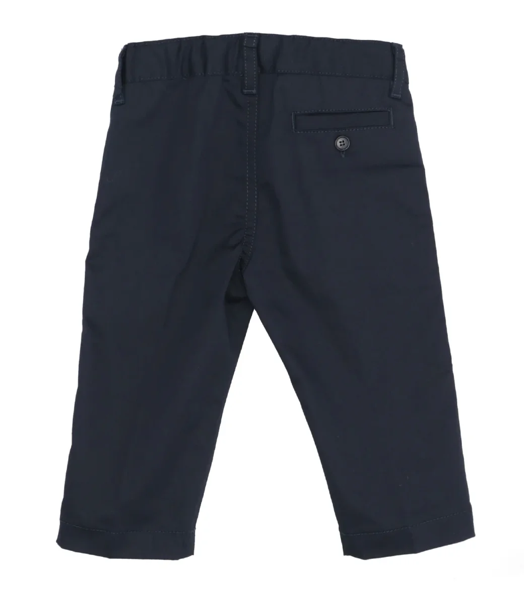 Pantaloni da neonato dal taglio classico in gabardine stretch blu, pratico elastico in vita, passanti per cintura e taschina a taglio con bottoncino sul retro