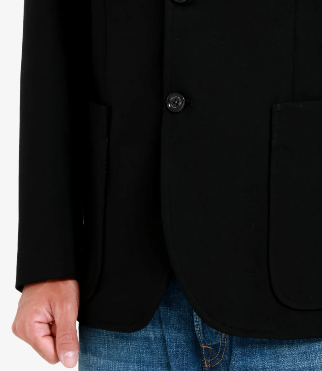 Giacca Paolo Pecora in viscosa ed elastene, rever classico, modello monopetto a doppio bottone, maniche con bottoni sui polsini, tasche a fessura applicate sul davanti, vestibilità slim.