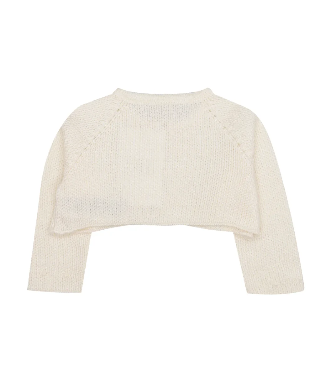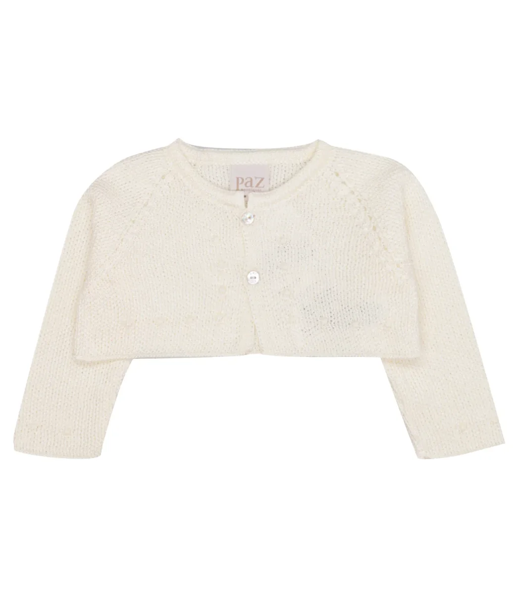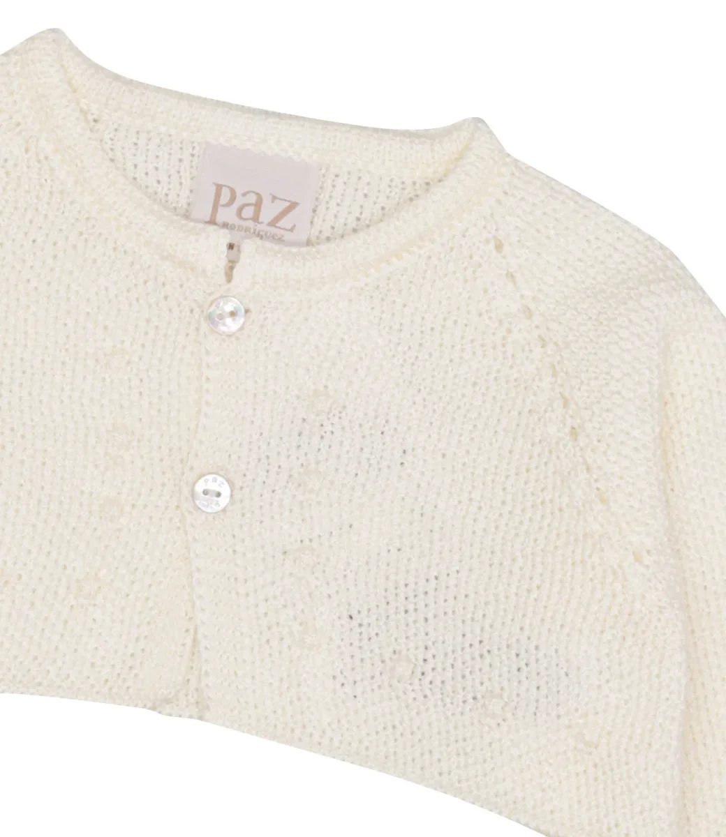 Cardigan Paz Rodriguez in cotone, lavorazione a maglia a chicco di riso. Chiusura frontale con due bottoni in madreperla. Collo rotondo. manica senza polsino.