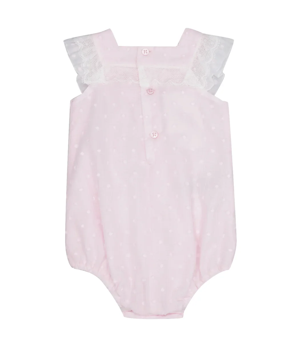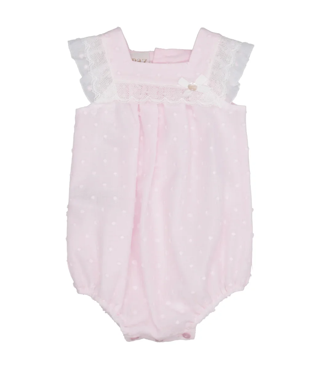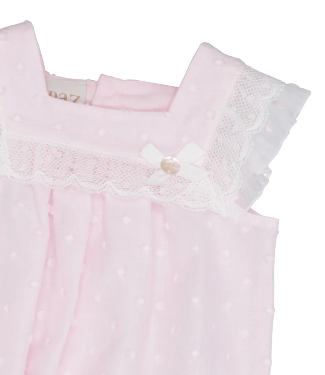 Pagliaccetto Paz Rodriguez in misto cotone con motivo plumetis all-over e finiture in pizzo. Chiusura con bottoni sul retro e sul fondo. Logo in madreperla sul petto. Modello corto.
