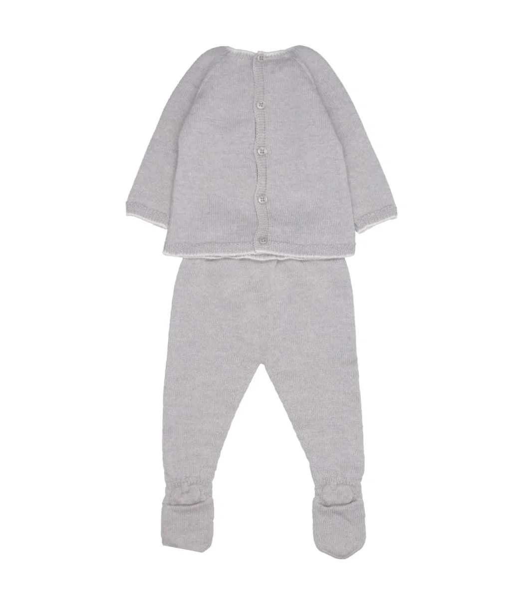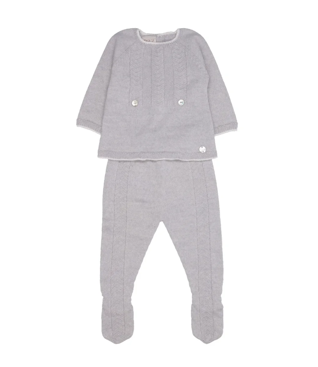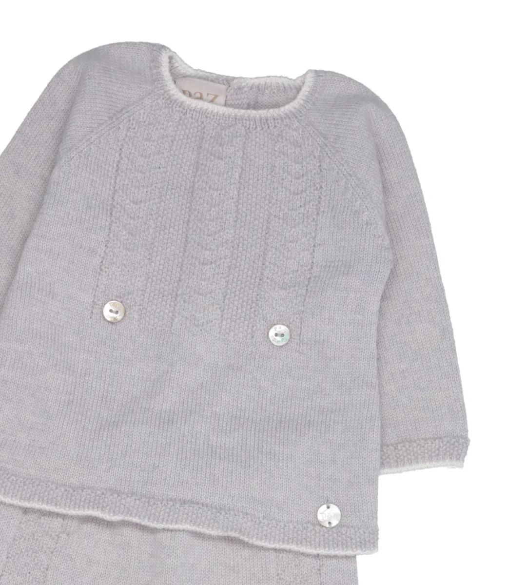 Set Maglia e pantalone Paz Rodriguez in lana, motivo a spina di pesce e bottoni decorativi in madreperla sul davanti, girocollo, chiusura con bottoni sul retro, maniche lunghe con polsini, fondo dritto con logo applicato sul laterale, con profili in contrasto. Ghettina con vita regolare, motivo a spina di pesce sulla lunghezza, copripiede.