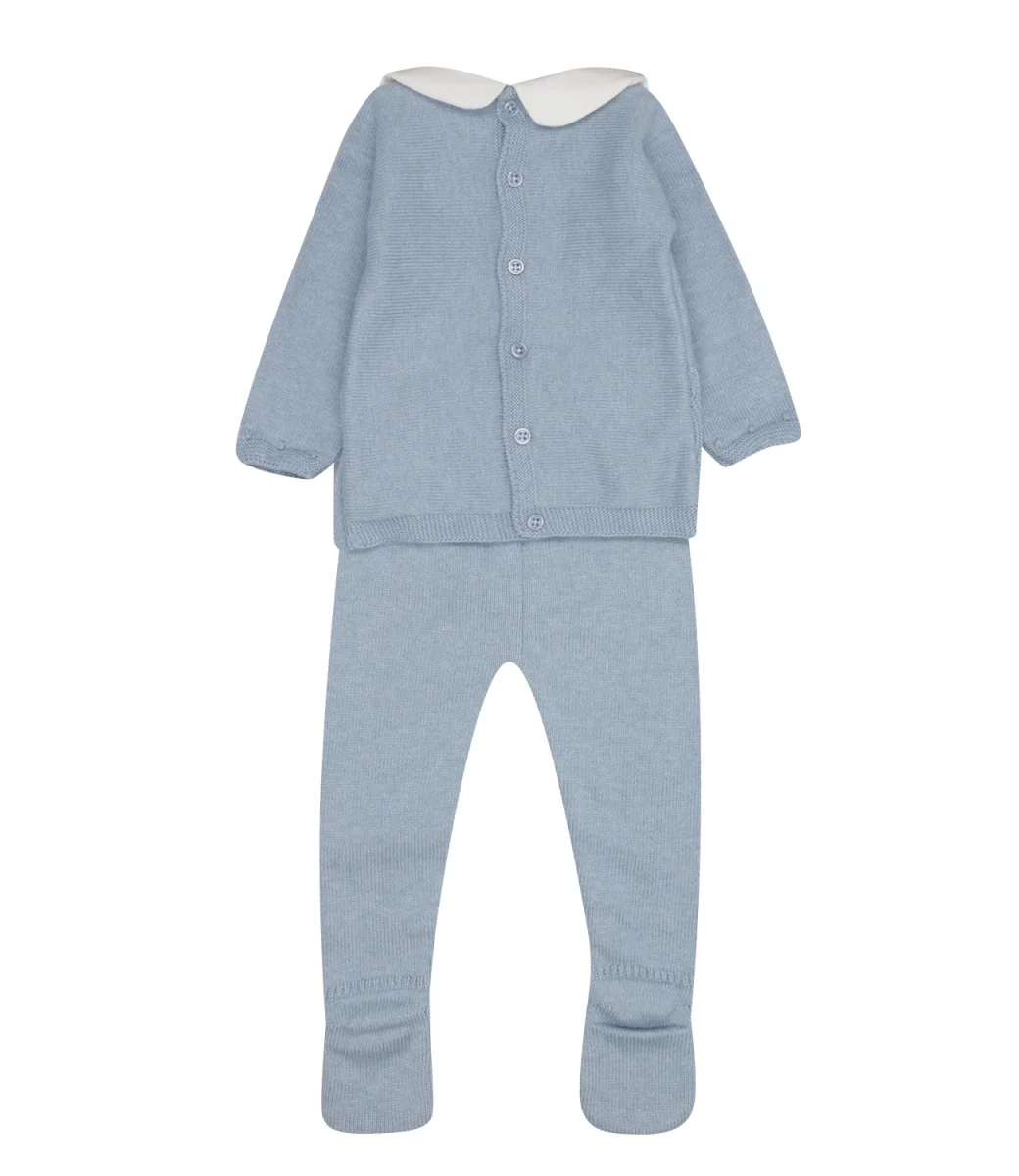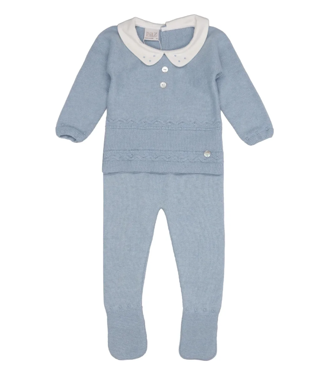 Set maglia e pantalone Paz Rodriguez Koala in misto cotone e cashmere, lavorato con motivo a maglia. Colletto club in tessuto, maniche lunghe con polsini lavorati. Dettaglio bottoni decorativi in madreperla sul davanti. Chiusura con bottoni sul retro, logo PAZ in madreperla applicato sul fondo davanti. Ghettina con vita regolare, copripiede decorato.