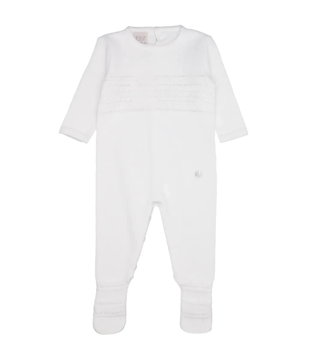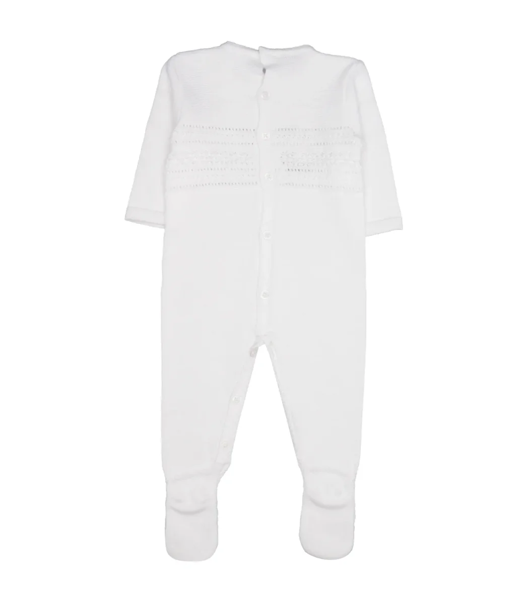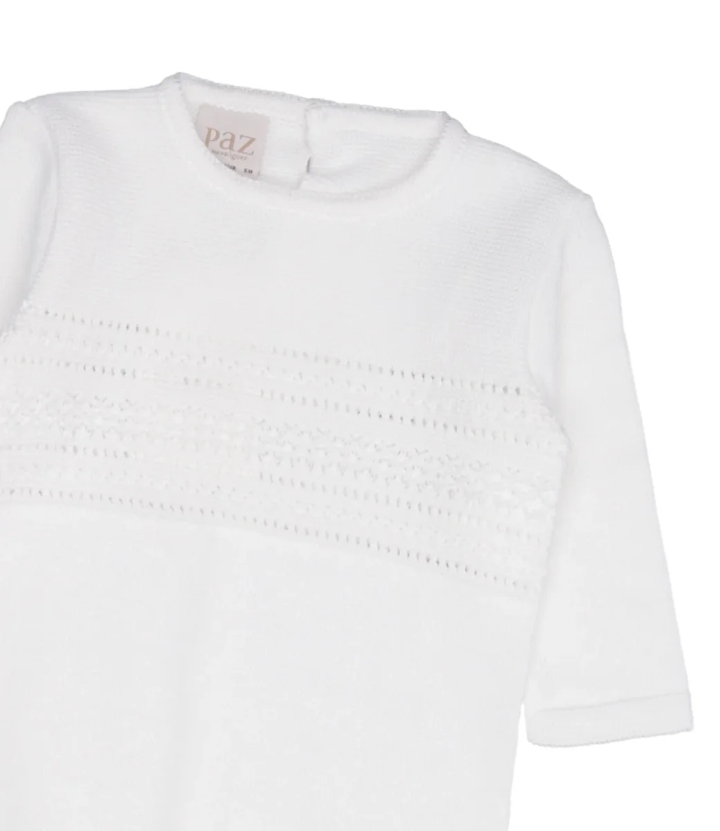 Tutina Piede Paz Rodriguez Sabana in cotone lavorato a maglia con motivo ricamato sul torace, girocollo con bordo ricamato, chiusura con bottoni sul retro, maniche lunghe, fondo copripiede ricamato.