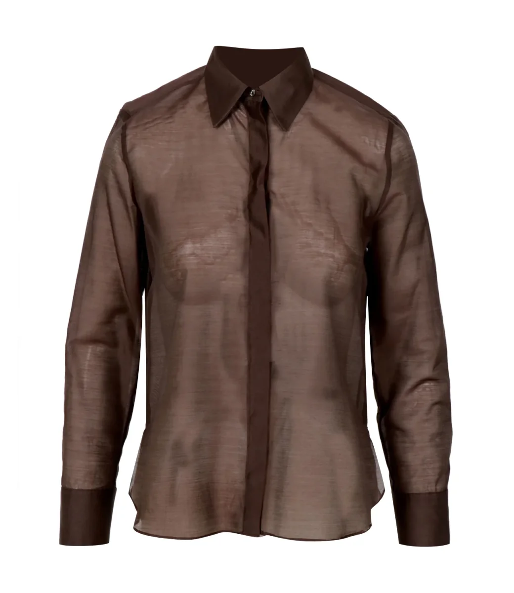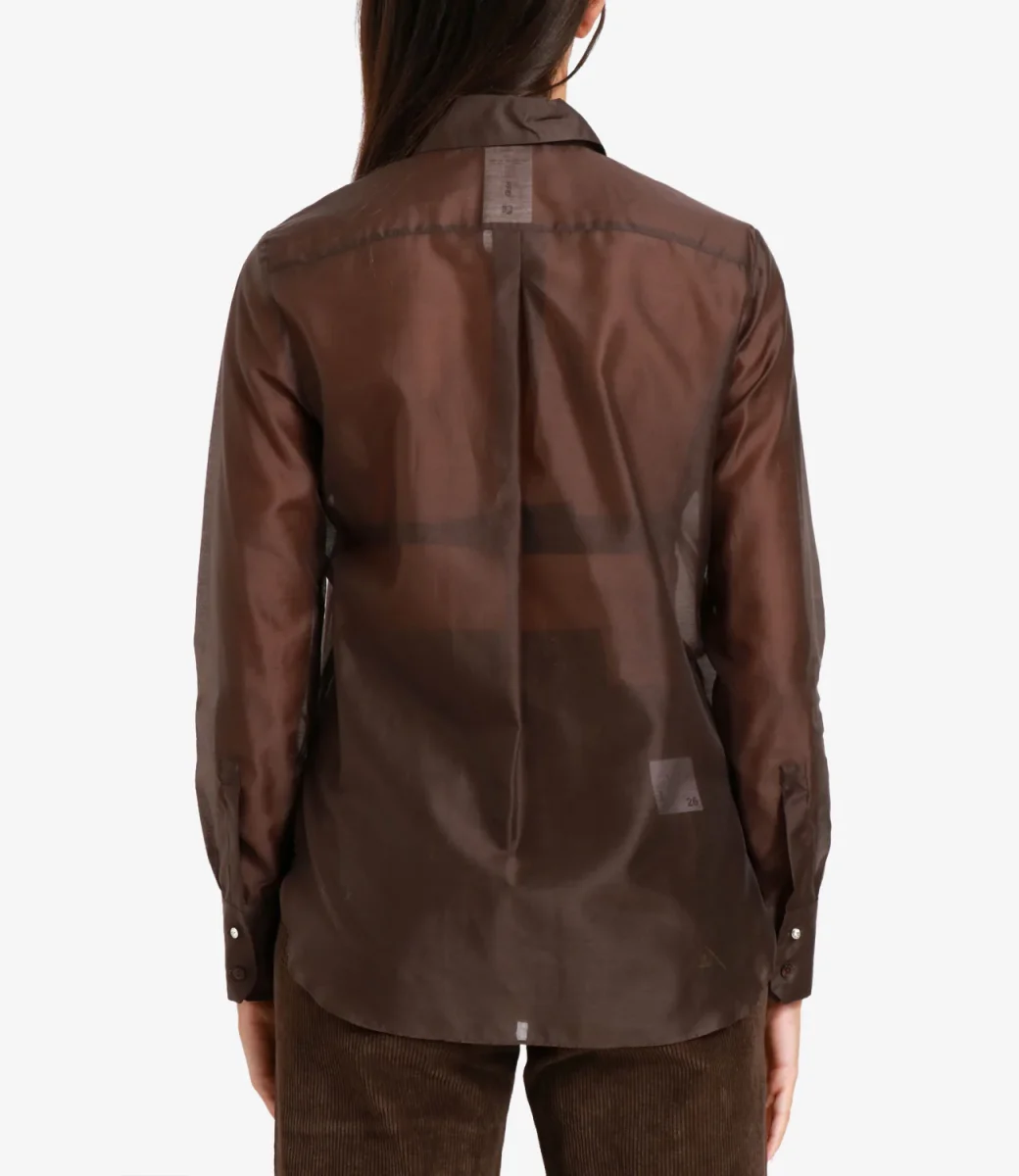 Camicia Pennyblack Check in organza. Design con bottoni bijou a collo e polsi, abbottonatura nascosta, carré e contropiega dietro, orlo arrotondato più lungo.